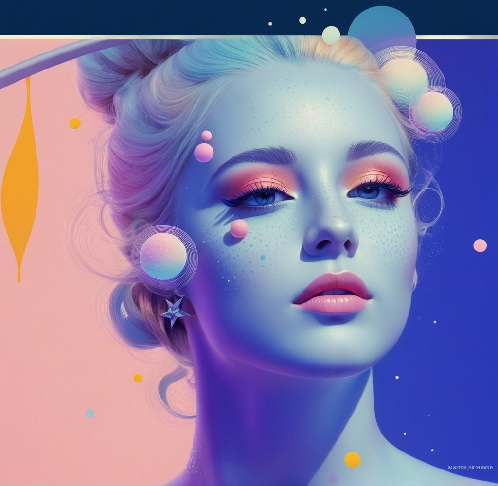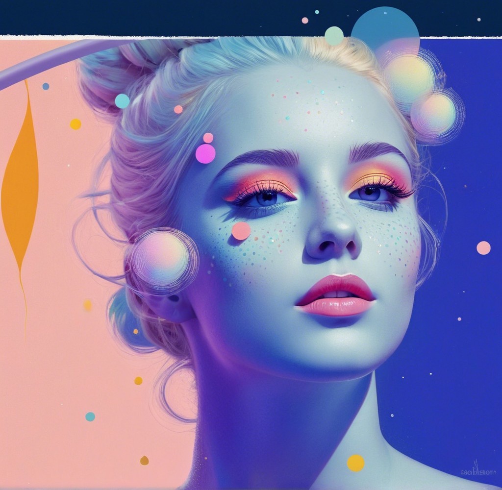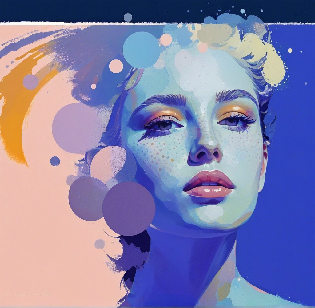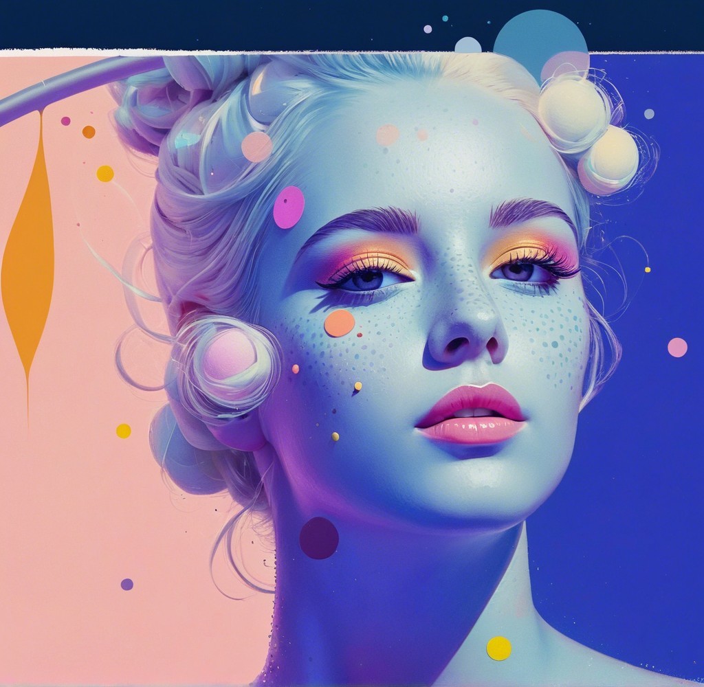 Prompt: Headshot consisting of flecks and splashes, stylized illustration, foampunk 1.7, fauvistic fractalization, bluish gradient colors, sci-fi illustration, cel-shaded, sculpted linework, specks, dots, color shapes, precisionism reminiscence, split toning, pointilism merged with orphism, liminal, hues by Ho Baron, circle motif, beads, complex color scheme, liminal, cozy warm color palette, remiscent of the styles of Lawrence Schwinger and Stan Lee, dynamic lighting by Cecilia Frigati and Esao Andrews, displacement mapping 1.3, visible textures, shadow mapping 1.3, mip-mapping 1.3, phong shading 1.3, mesmerizing fusion of pigmented oil and oiled charcoal textures, compressed charcoal, black outlines, black conte crayon, creating a rich tapestry of textures. Streamline_moderne influence, otherworldly simplicity, perpendicular line-art features, triadic color scheme starfleet-blue light-pink black expressive brushstrokes, dissolving raytraced shadows 1.8, lavish shapes, coal dust, fabric-inspired textures, subtle reddish and bluish tones, gradient pastel accents, dynamic lighting, drips and splashes, indiecore flair, harmonious arrangement, ((whimsical touch (rimmed lighting, grey and light-black outlines), .estranged cuteness with a touch of Tim Burton and Man Ray) 8:13), excessive use of blended paints, distorted perspective,