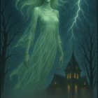 Michael Turner Comic, extreme closeup, ultra-gorgeous long mature face, big gaunt cheekbones thin red lips, bright glowing eyes, age 45, bright green very transparent, beautiful tall slender mature blonde Carmen Dell' Orifice as Halloween ghost woman in flowing diaphanous nightgown and long platinum blonde glowing hair blowing in wind, floating high in air above of a 3 acre lit up haunted Mansion, scary bare black trees, rain, lightning,