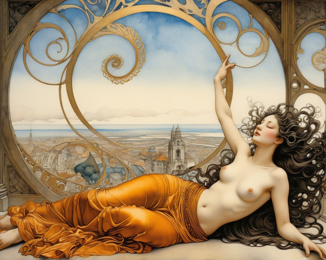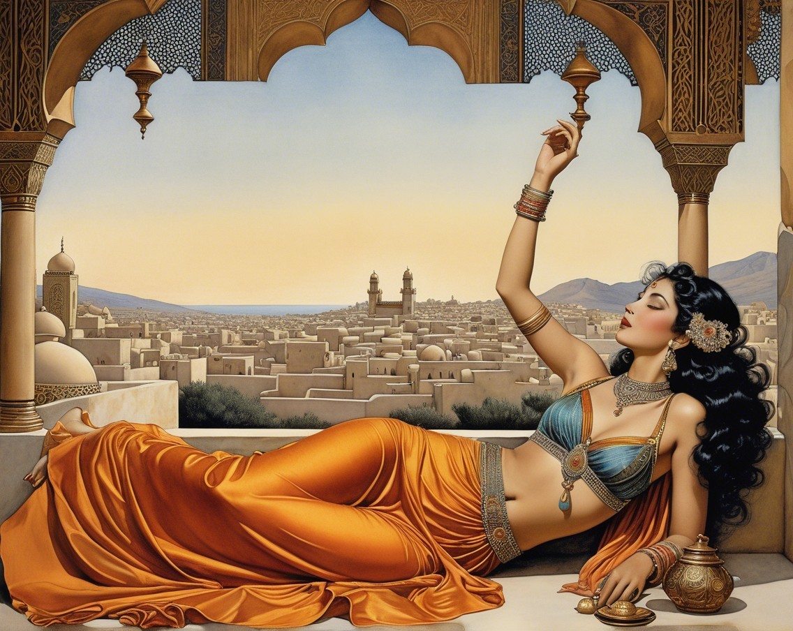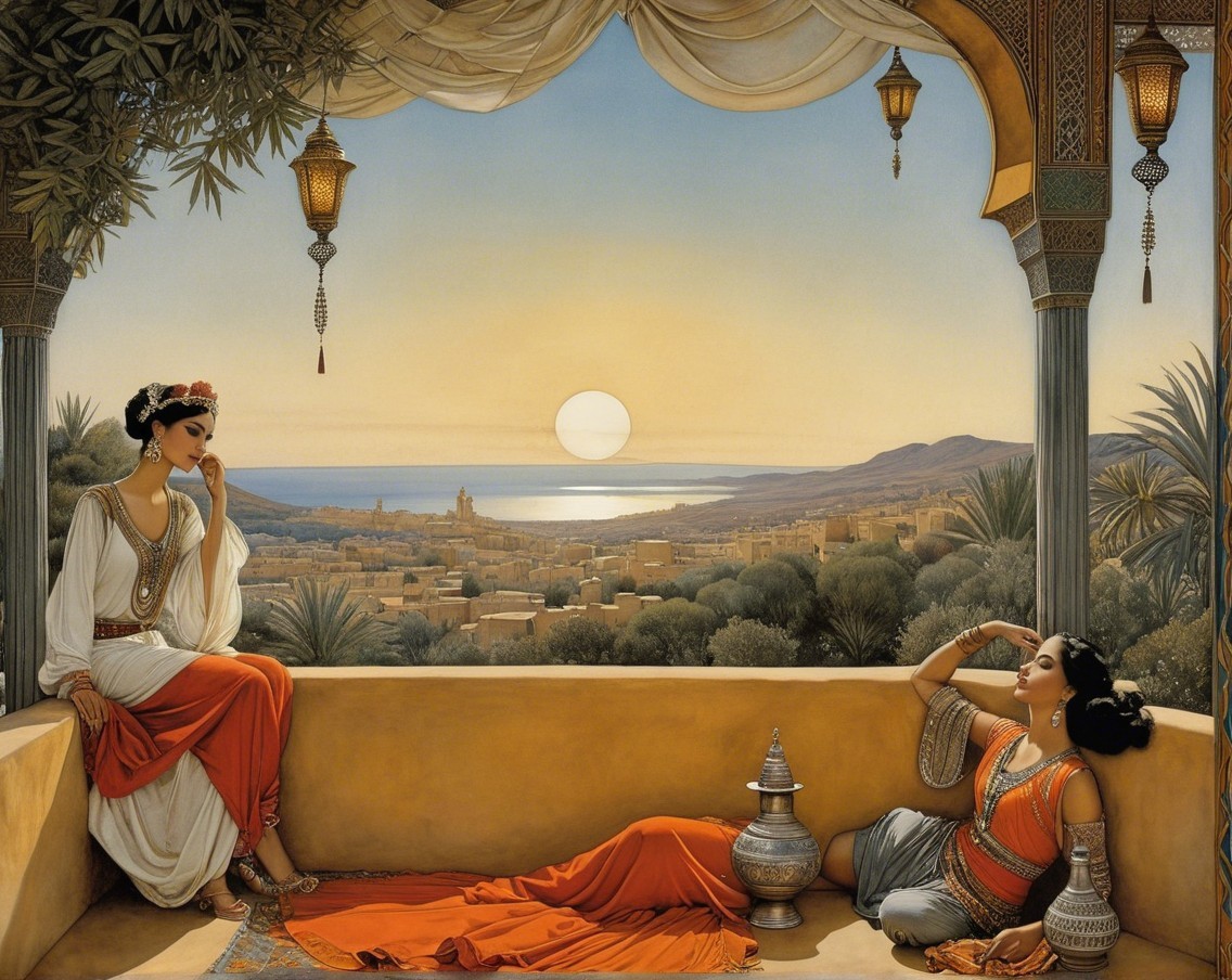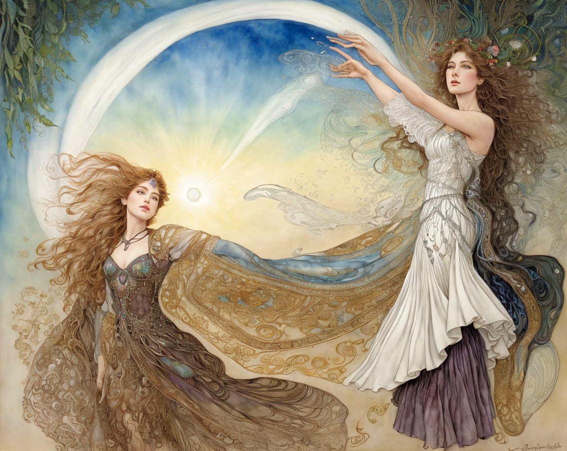 Two ethereal women entwine against a backdrop of a crescent moon and soft clouds. One wears a flowing gown, while the other is draped in shimmering fabric, exuding enchantment and grace.