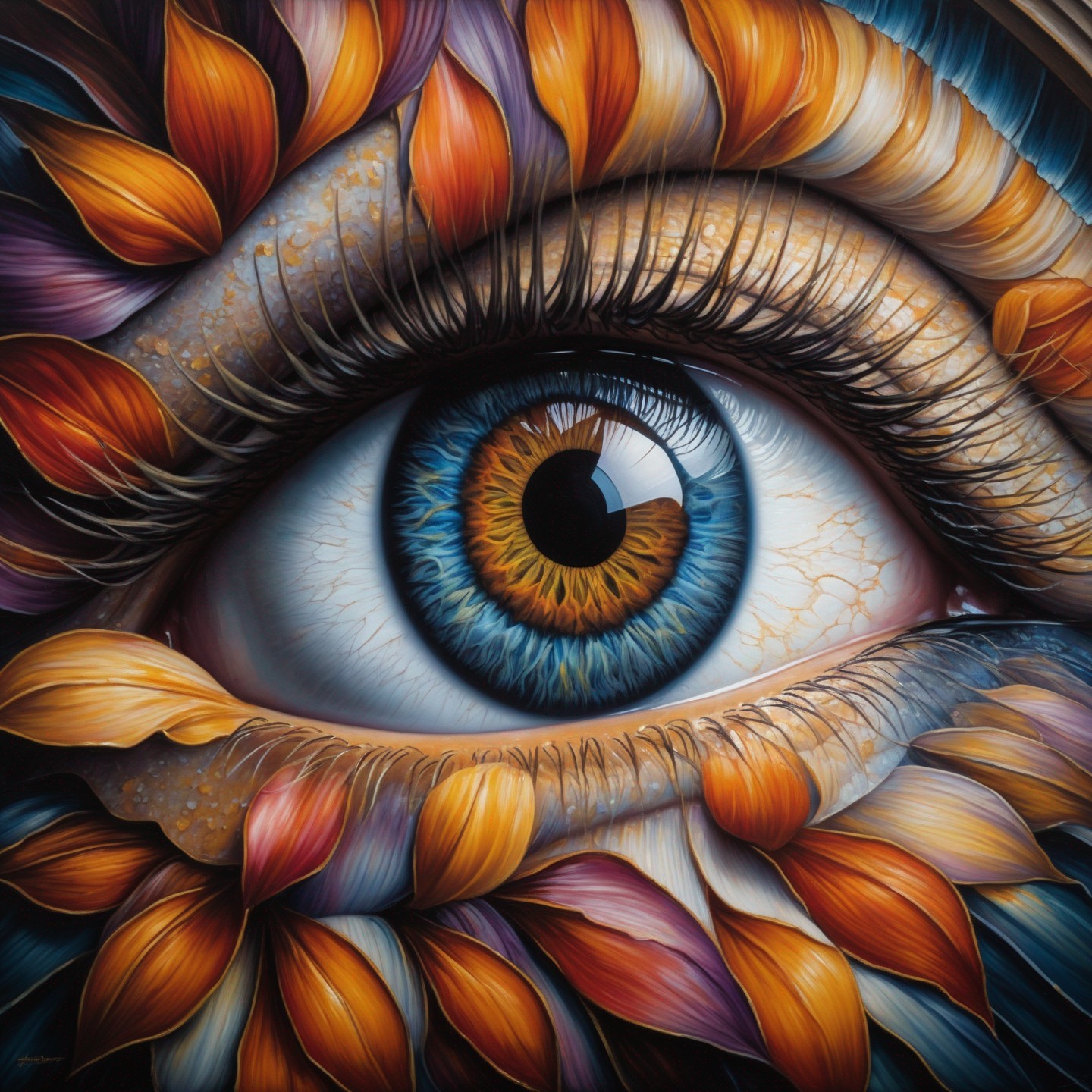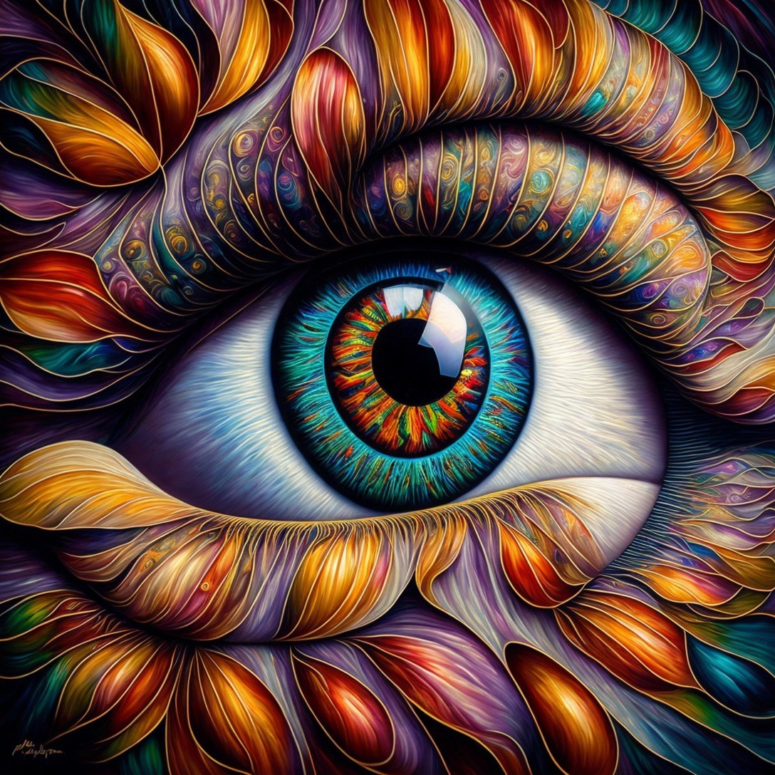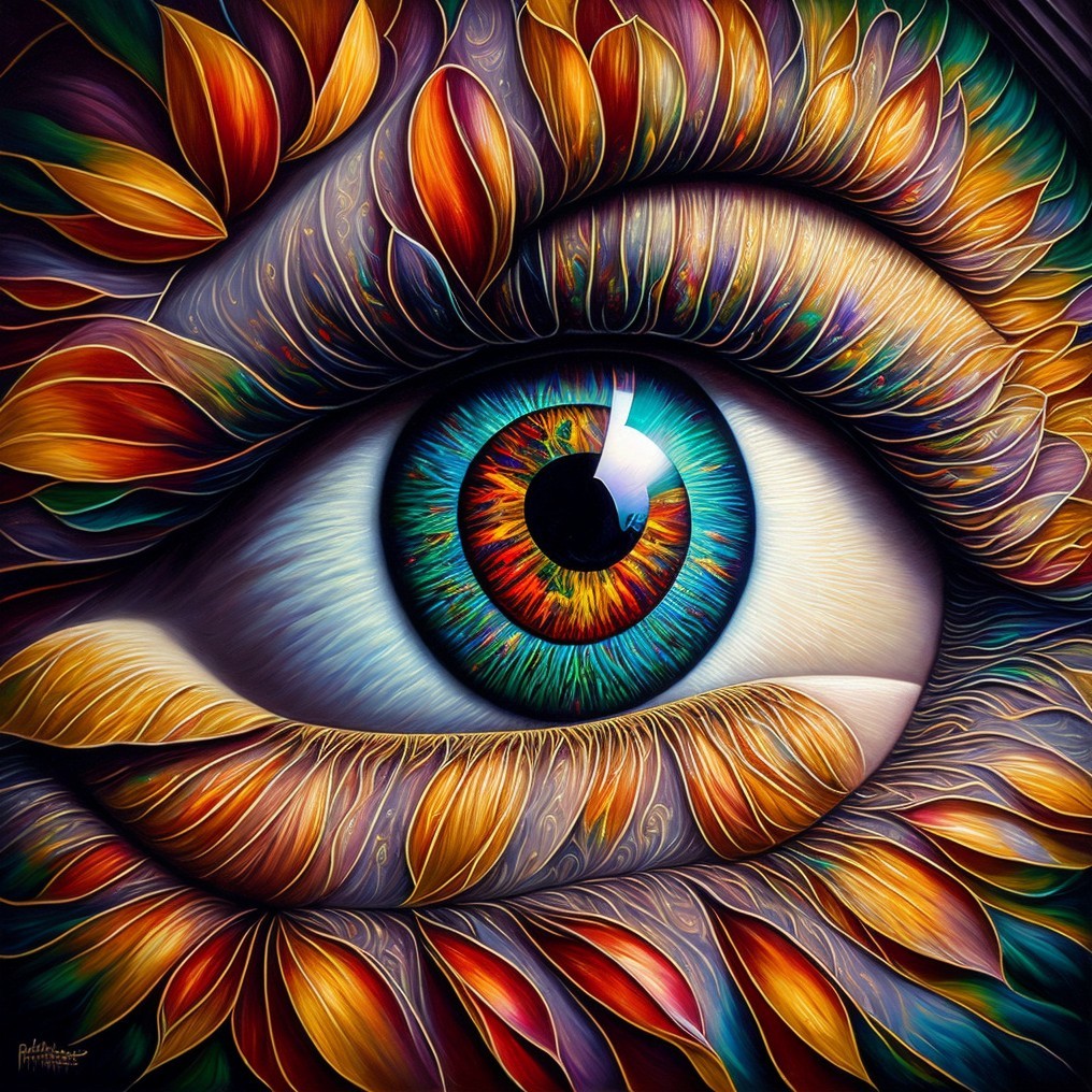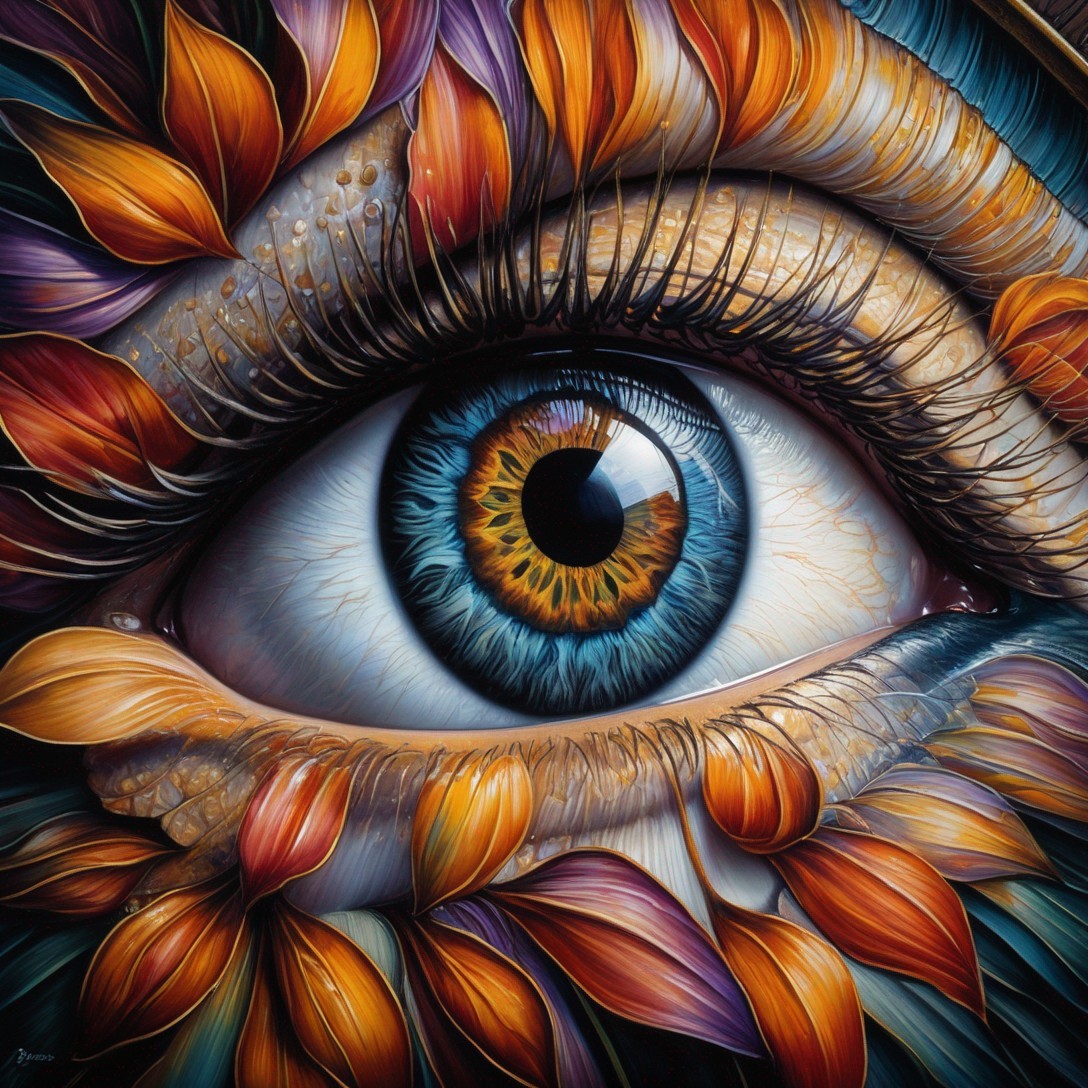 + Prompt:eye on wall in stairwell represents introspection, brilliant richly colored painting, stairs are depicted with precision, details for eye on wall: realistic detailed with hyper-realistic centered iris & pupil, with reflection & whites of eye are visible & bright, enhanced line & geometric, precision & 3D elements, insanely detailed, hyper textures, Fabian Perez, patrick nagel, Tony Robbin, Pino Daen, Hans Erni , Peter Doig ,Albrecht Dürer, Escher ,Anthony Hill, Leonardo da Vinci , Man Ray, Dali, Beksinski , 16K HDR, hyper quality, 3D enhancements, High Resolution, multi-layered, enhance vibrancy & clarity by 100%, impeccable linework & precision, 16K Clean lines, angles one screen & one scene, good lighting