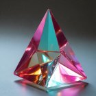 A vibrant, glass prism in the shape of a pyramid, reflecting a spectrum of colours. Its smooth surfaces create beautiful light patterns against a soft, muted background.