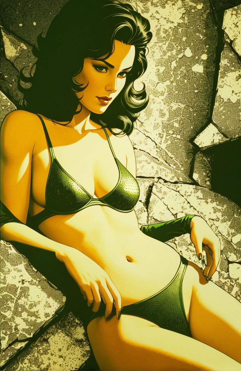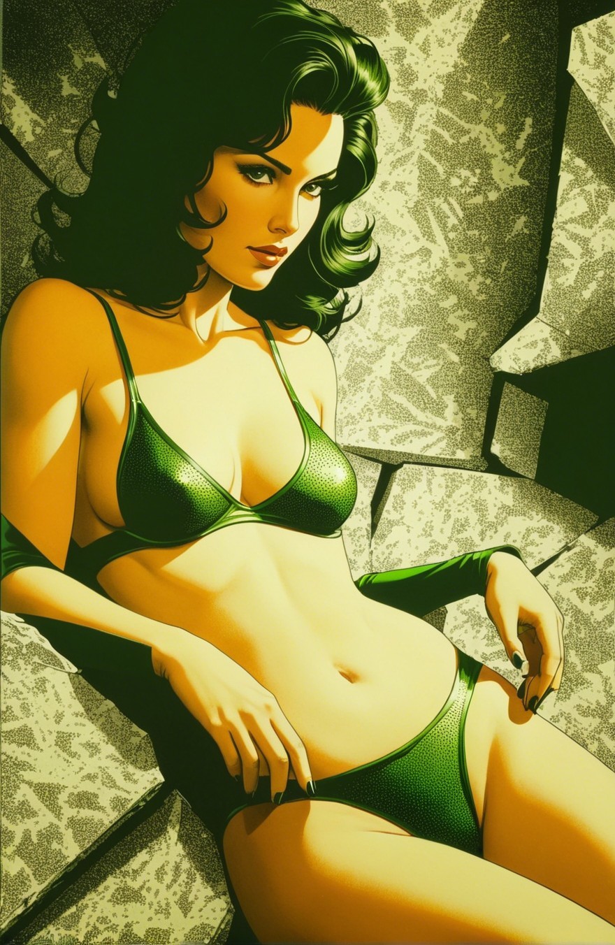 Prompt: Portrait, stylized female headshot, coloring by Gustave Loiseau and Ho Baron, mysterious, liminal, joyful, pointilism, dotted, dappled, side view, angled, close up, stylized 1980s heroine, dof, debeh, bokeh, quaint, liminal, rimmed lighting, comic book cover art, stippled, tesselated, angled, upper body portrait, displacement mapping, dendritic structures and patterns, curvaceous, perpendicular linework, overexposed, shading of light-green and green-yellow, otherworldly appearance, half-lit pores, fine lines, natural asymmetry, painterly effects, raytraced shadows 1.8, shadow mapping 1.4, phong shading 1.1, light-green merging with yellowish accents, LiDAR point cloud, negative lucas numbers, pointilism coloring, impossible light transitions, futuristic, cel-shaded, abstract post-avantgarde, luminosity 1.3, brightness 1.7, luminosity adjustments, liminal, expressionistic realism, merged styles of Stan Lee and John Buscema, dyed cubist reminiscence by Mark Ryden and Ed Binkley, lighting and embodiment by Freda People, beautiful line-art with pointilism, tetradic color scheme sea-green light-green forestal-green light-yellow, indiecore details, wavery rimmed lighting, dappled zentangle, angular lighting, dreamy dystopian portraiture, juminocore merged with realistic expressionism, stylized illustration, colourful surreal lines and forms akin to fractals and cymatics, dendritic linework, executed using fine-tipped pens, complex color scheme with gradients of lush deep greens and light beiges, accented by hints of and dark-red, lavishly clustered, sci-fi, advertising art, 1980's fantasy reminiscence, incorporating splashy droplets for a fresh and vivid look, abundant in geometrical beauty, black and grey lines and marks are enhancing the organic shapes and fractalized elements, fauvistic influence from zebradi, luminism. Intricate zentangle clouds with swirling patterns and delicate linework, created on white paper. The artwork is an abstract piece with high contrast, mip-mapping, displaced color shapes featuring asymmetrical designs and intricate shading, fusion of Ho Baron & William Bradley's essence, coloring techniques inspired by Man Ray and William Bradley, complex coloring style, paper-cut art techniques. Old paper texture, 128K, crisp quality, intricate detail, collage-art merged with zentangle line-art, evoking 1980's fantasy art,