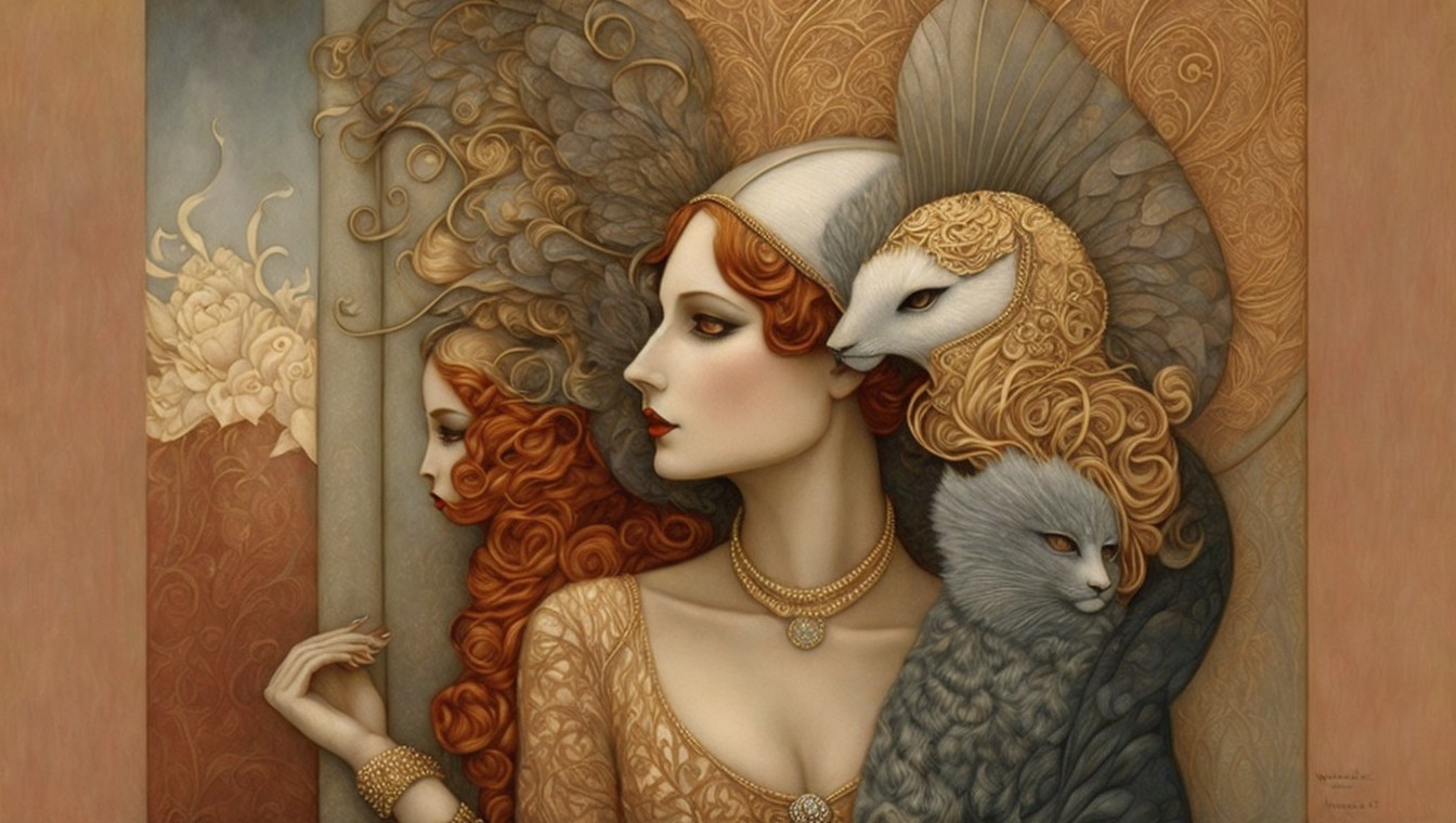 The image features two elegantly dressed women. One wears a unique bird-like headpiece, while the other sports a feathered headdress, both exuding a sense of glamour and mystique.