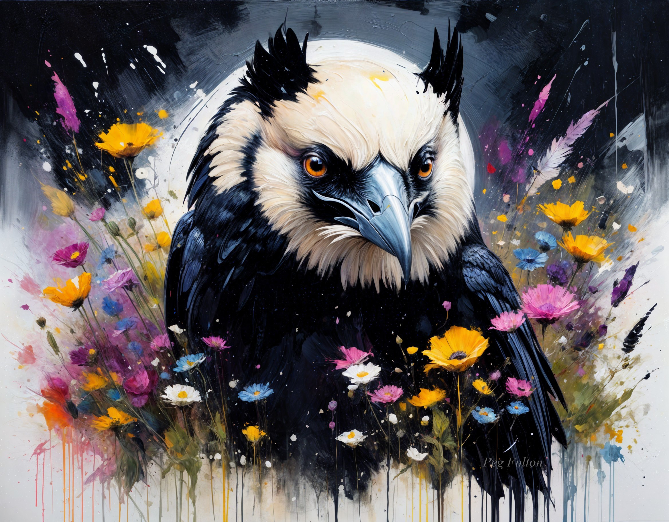 A striking, colorful artwork of a powerful bird with a distinctive white head, surrounded by vibrant flowers against a dark background. The piece exudes energy and modern artistic flair.