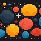 The image features a stylized representation of planets in various colors—golden, blue, and red—set against a warm, brown background, along with small star-like shapes.