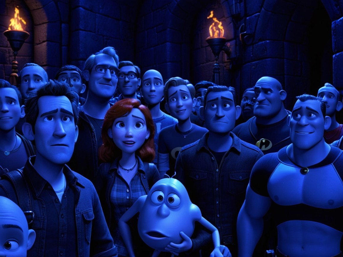 A group of animated characters stands together in a dimly lit, blue-toned setting, displaying varied expressions of surprise and concern, with shadows casting an eerie atmosphere.