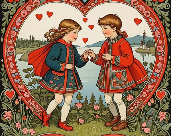A vibrant, colorful landscape featuring whimsical houses along a serene lake. Sailboats glide across the water, flanked by rolling hills and a bright sun set against a starry sky.