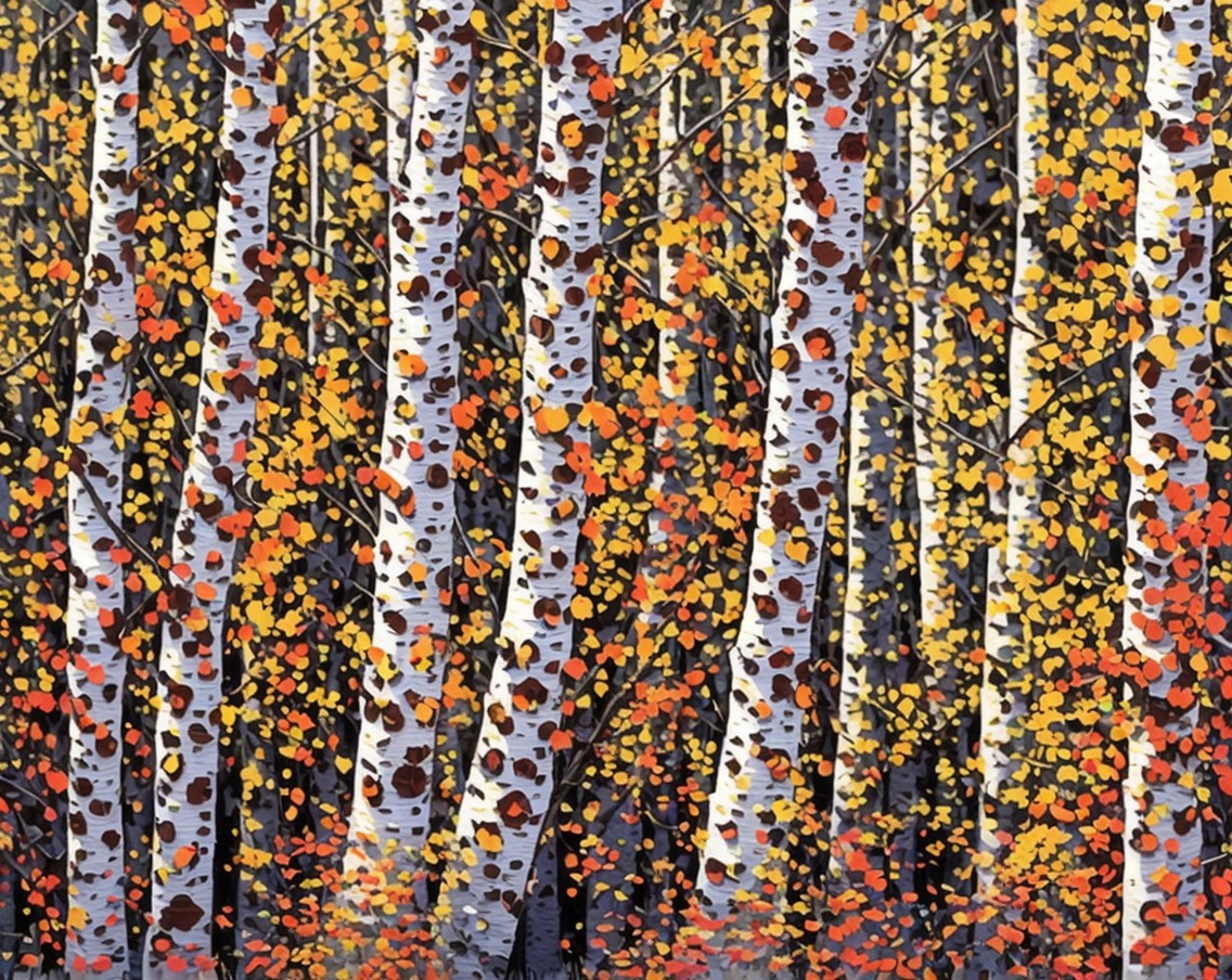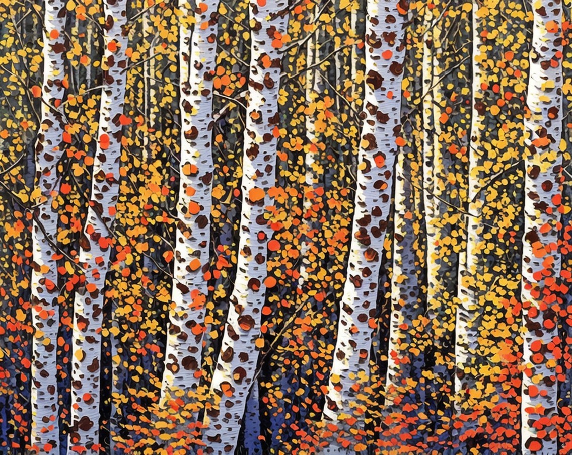 An artistic depiction featuring numerous vertical Aspen trees covered and surrounded with overlapping circles in warm Autumn tones. Creating a stylized abstract forest.