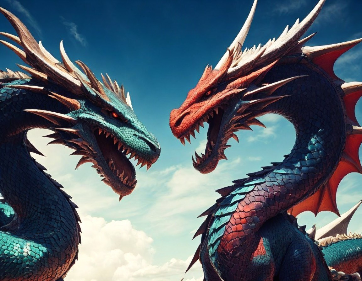 Two majestic dragons face each other, one shimmering blue with silver accents, the other a fierce gold and orange. A picturesque landscape sets the stage for their powerful confrontation.