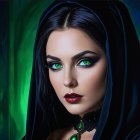 A striking portrait of a woman with captivating green eyes, deep purple lips, and dark hair, wearing a black veil. The background features dim candlelight and shadowy textures, creating a mysterious ambiance.