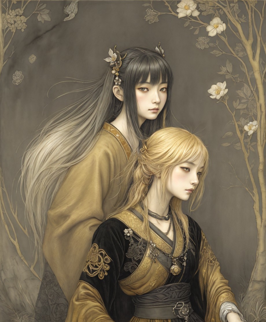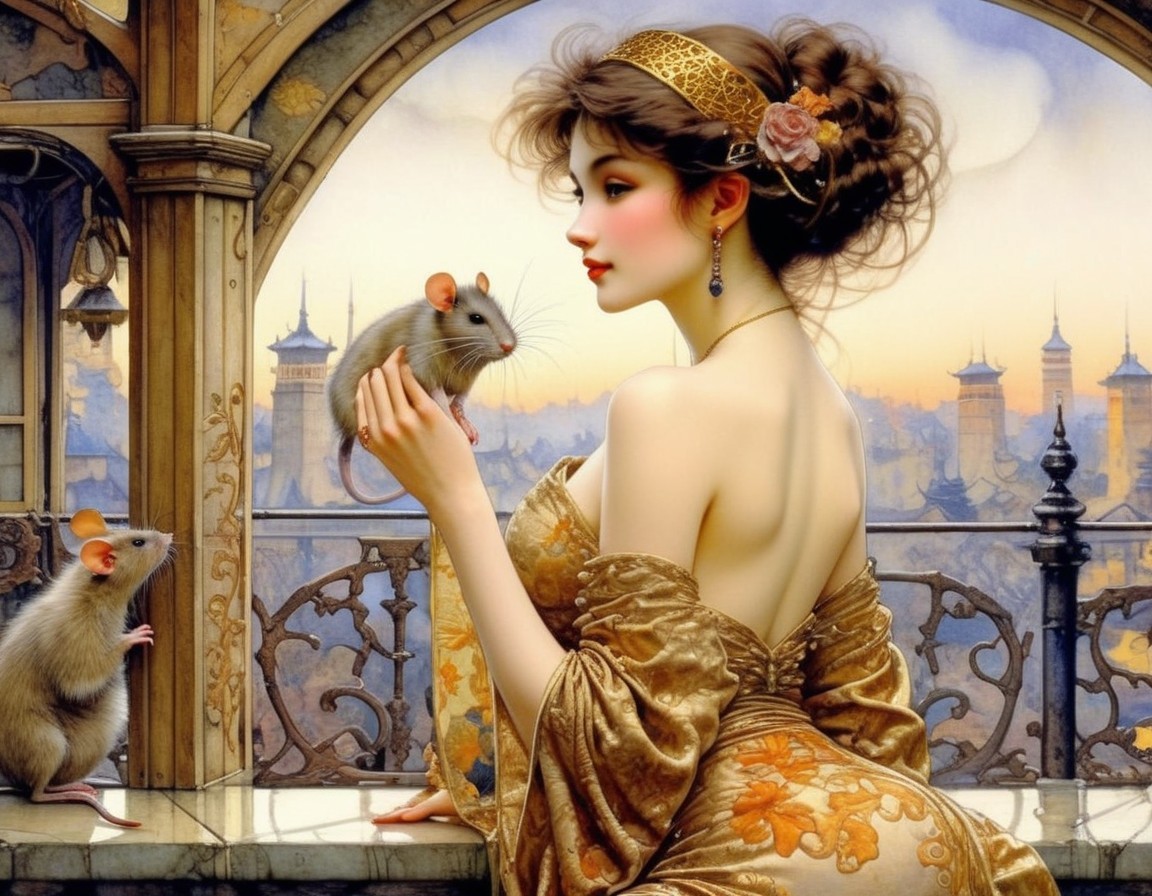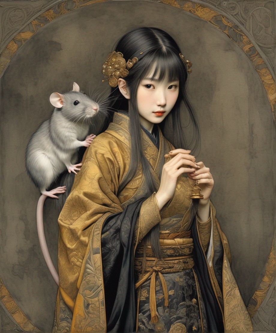 Legend of the Girl and the rat, Medieval Japanese Artists Sumi-e Style, Velvet Black, Shabby, Dull Gold, Amber Gray, Golden Ratio, Surreal Fantasy, Elegant, High Definition Ultra Fine 3D Line, Zenangle Style, Watercolor Patchwork , Arthur Rackham Style, Paul Kidby, Gediminas Prankevicius, Jacek Jerka, Extremely Detailed, Intricate, Thoughtful, HDR, Fractal, Beautiful, Award Winning, Fantasy Look, Fantasy, Crisp Quality