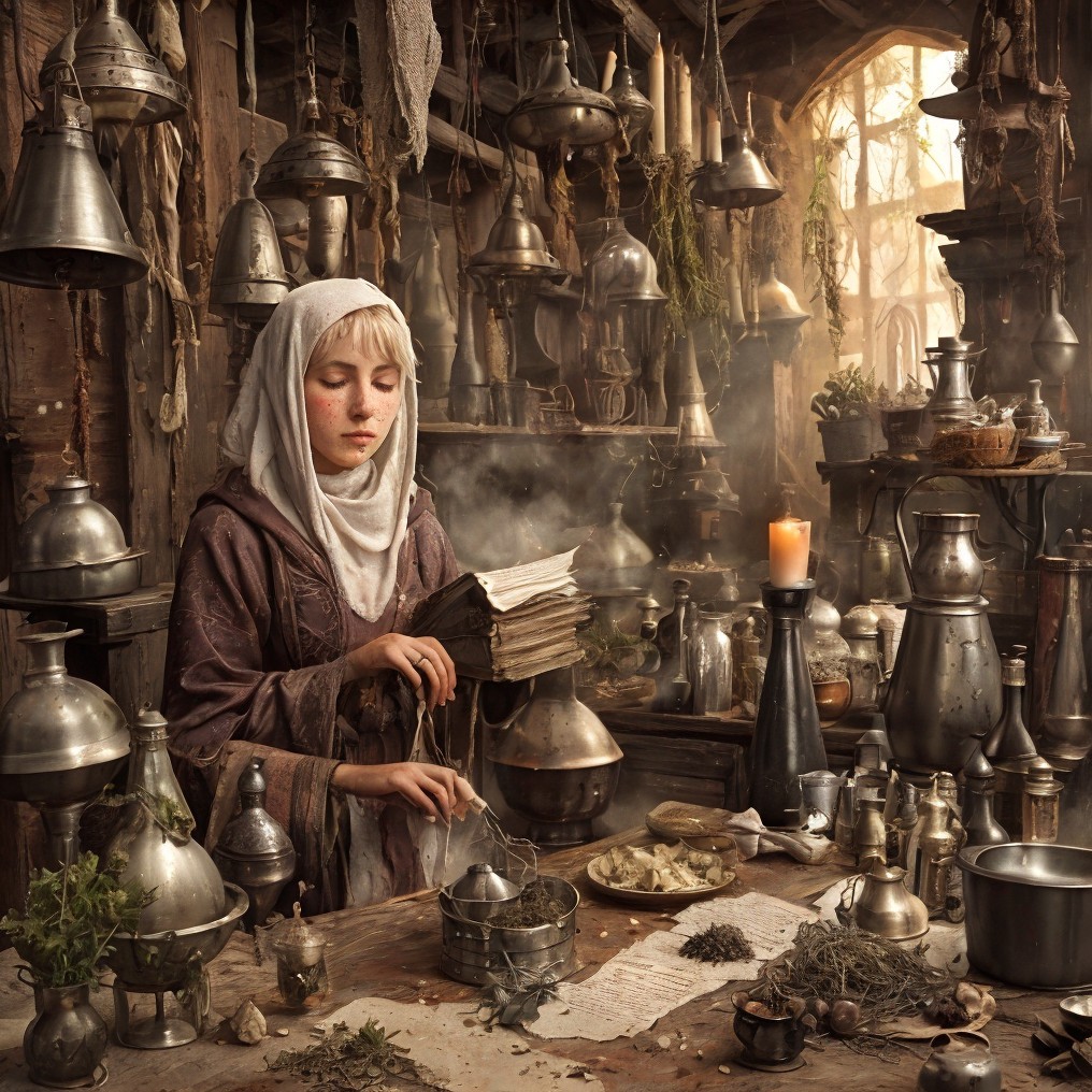 Prompt: Stiff sheafs of parchment branded with iron-gall ink, sweat-soaked and tattered robes, pestle-beaten herbs. Only the brave journey through the disorienting haze, you’ll find something revelatory, almost even sweet: Radagastian, feral, cryptic, scholarly, benevolent, unsettling, musty, mossy, medieval. The air lingers and lingers, like dust