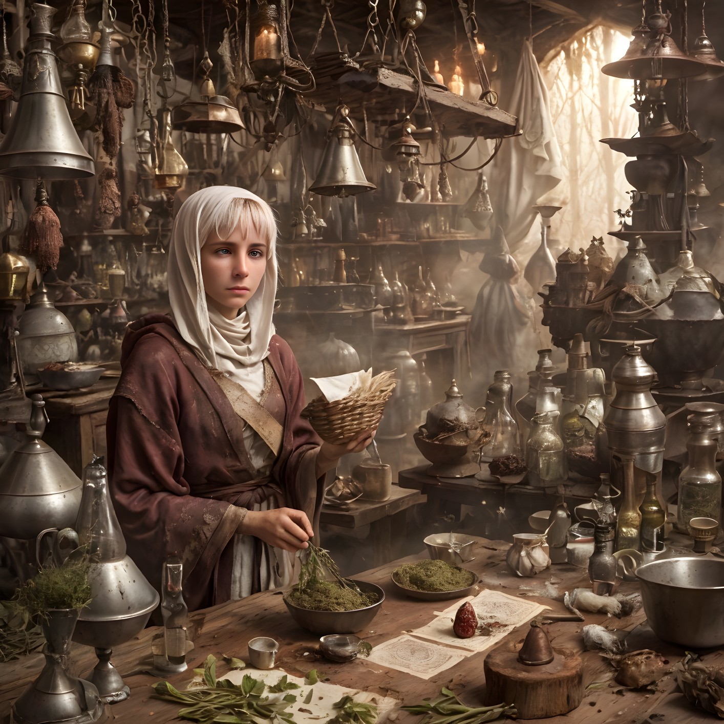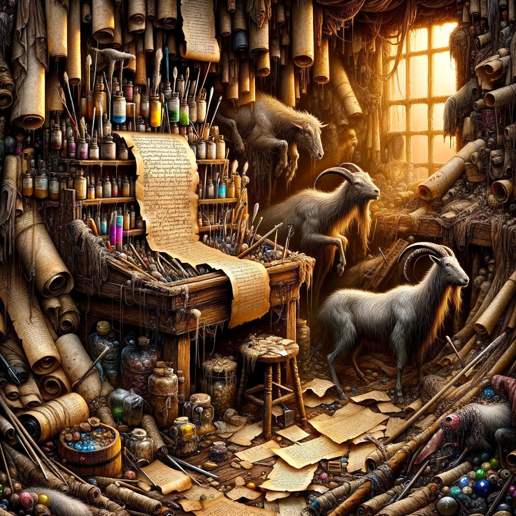 Prompt: "Stiff sheafs of parchment branded with iron-gall ink, sweat-soaked and tattered robes, pestle-beaten herbs, goat hair, a long-unwashed beard. Only the brave journey through the disorienting haze, you’ll find something revelatory, almost even sweet: Radagastian, feral, cryptic, scholarly, benevolent, unsettling, musty, mossy, medieval. The air lingers and lingers, like dust"