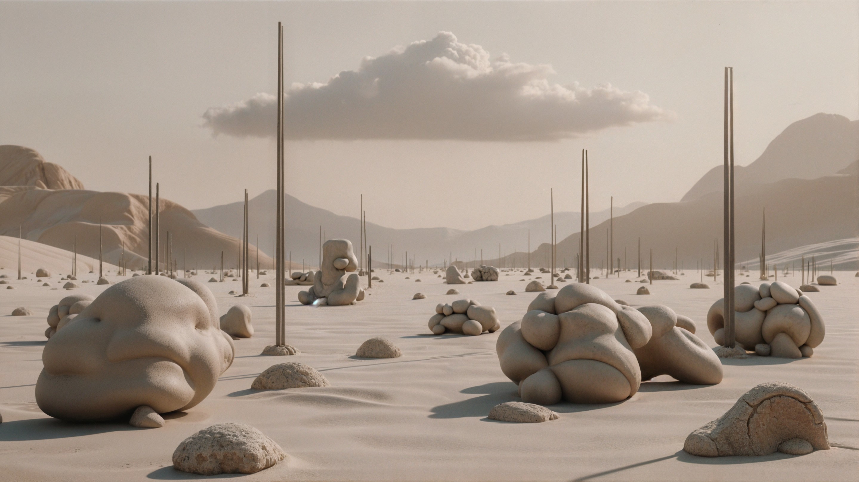 A surreal landscape features large, smooth boulders scattered across a sandy expanse, punctuated by tall, slender poles rising from the ground, under a soft, solitary cloud.