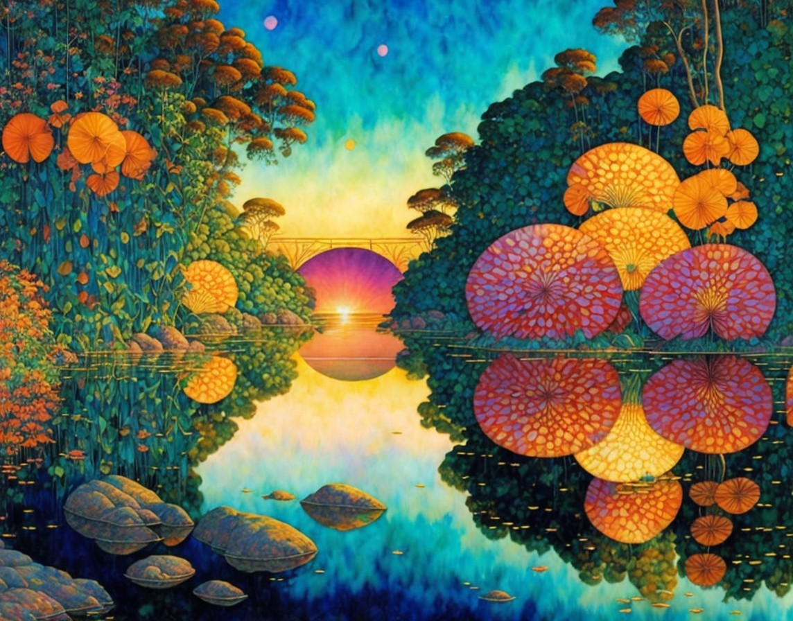 Prompt: Full page, single image, 3D watercolor patchwork, spectacular sunrise reflected in a beautiful Tingatinga style jungle river, satiny, high quality, shimmering, with vibrant spectacular colors, elegant, highly detailed, glistening magic style, by Maxfield Parrish