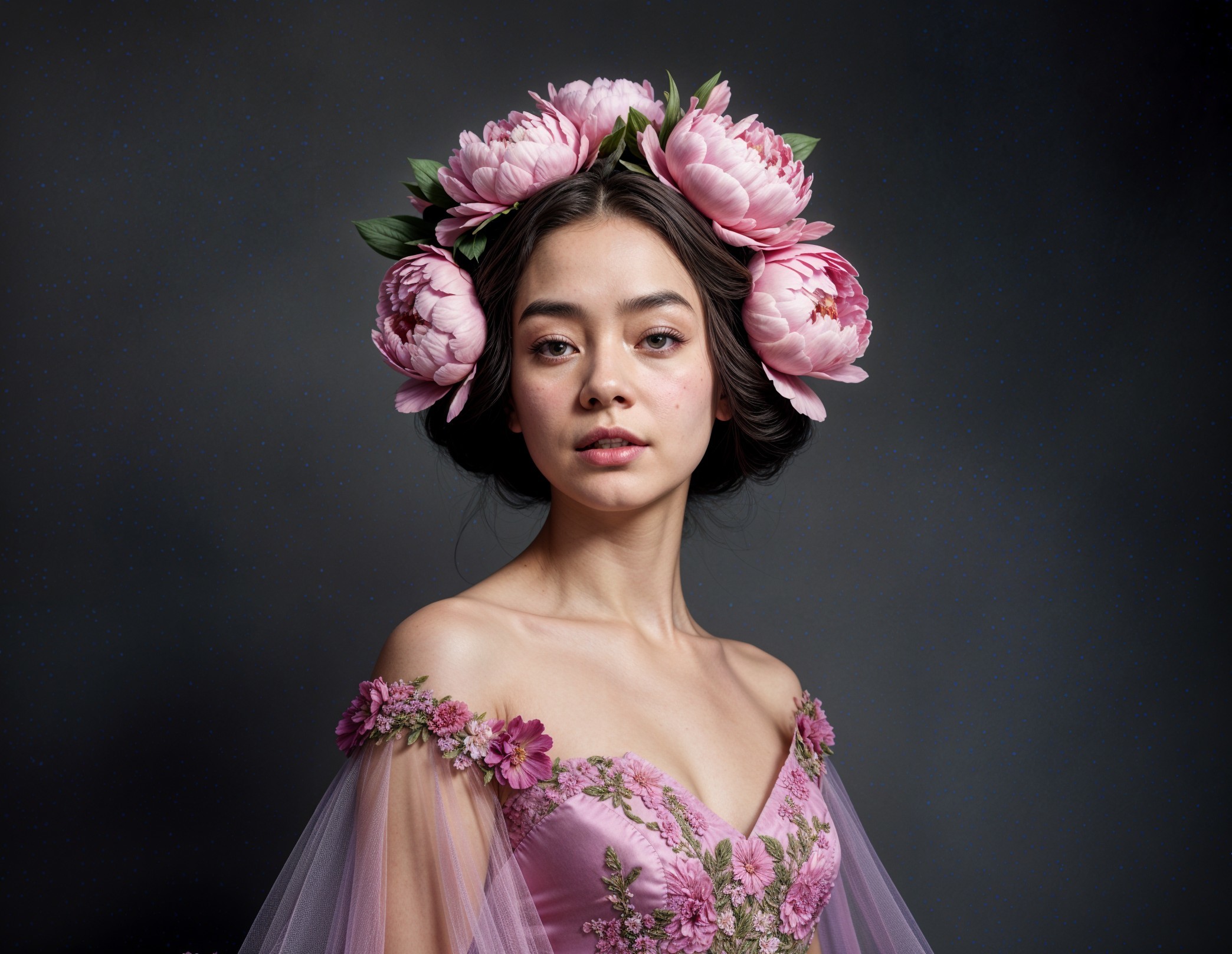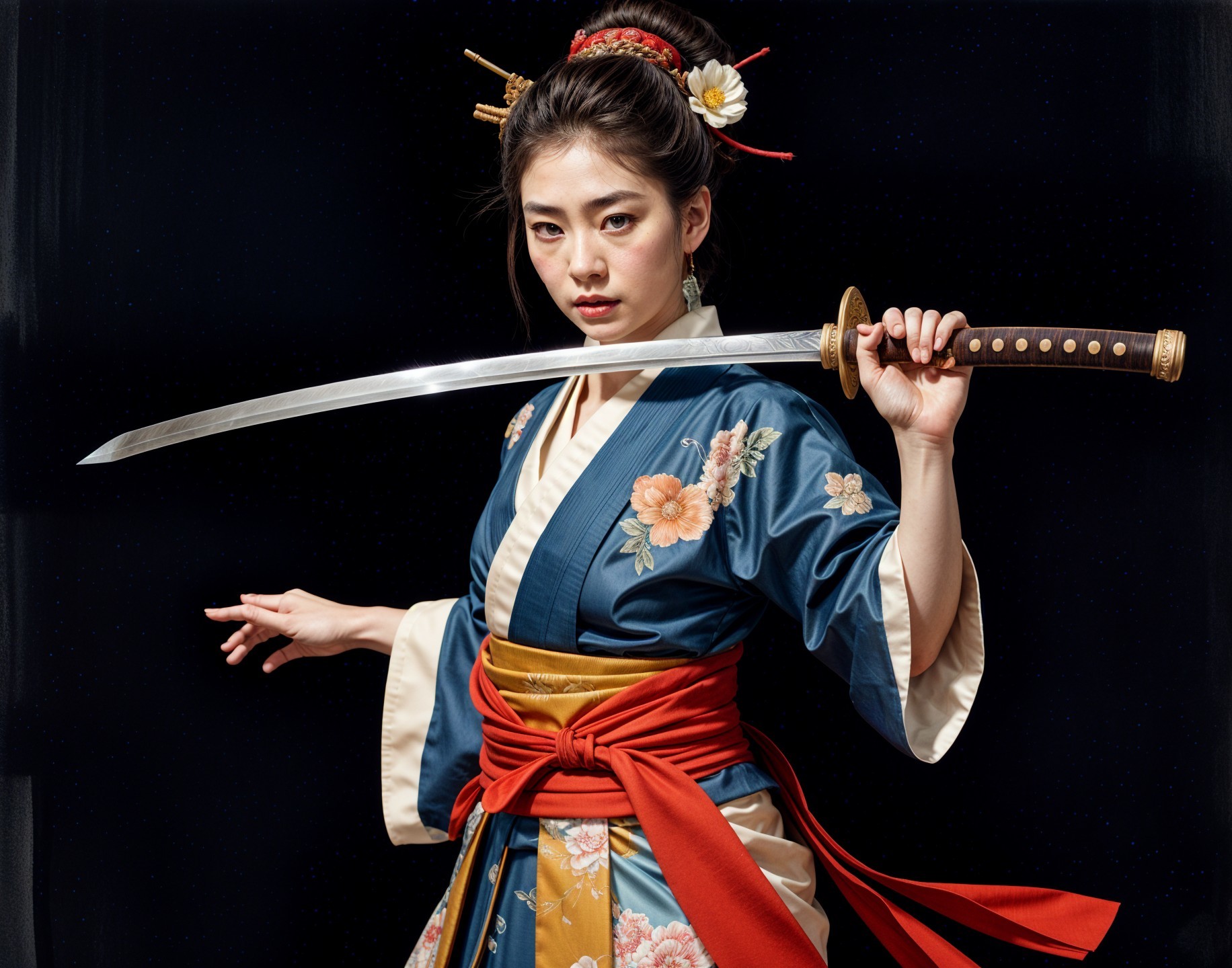 A fierce warrior stands poised, wielding a sword with determination. Dressed in traditional attire, she exudes strength and grace, her flowing hair and ornate details enhancing the dynamic atmosphere.