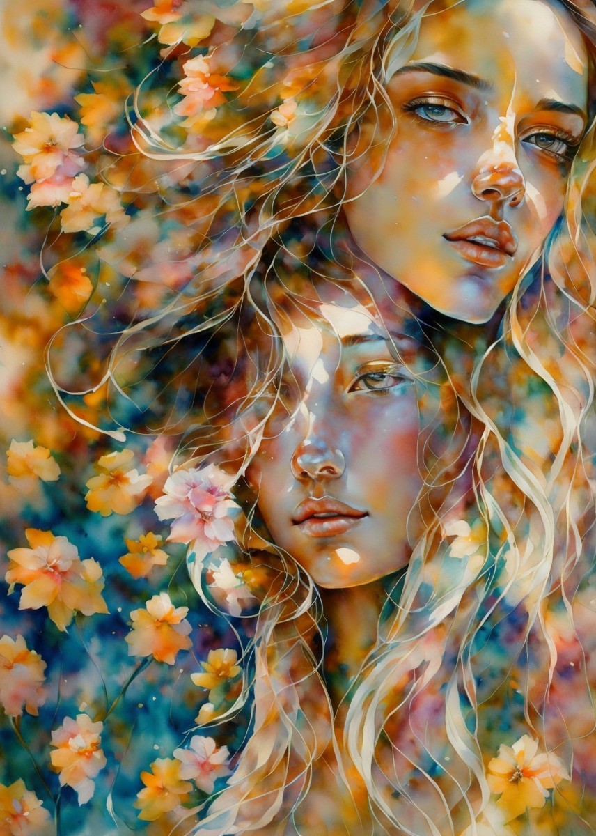 A painting of a woman with flowing hair among vibrant, ethereal flowers with a dreamlike quality.