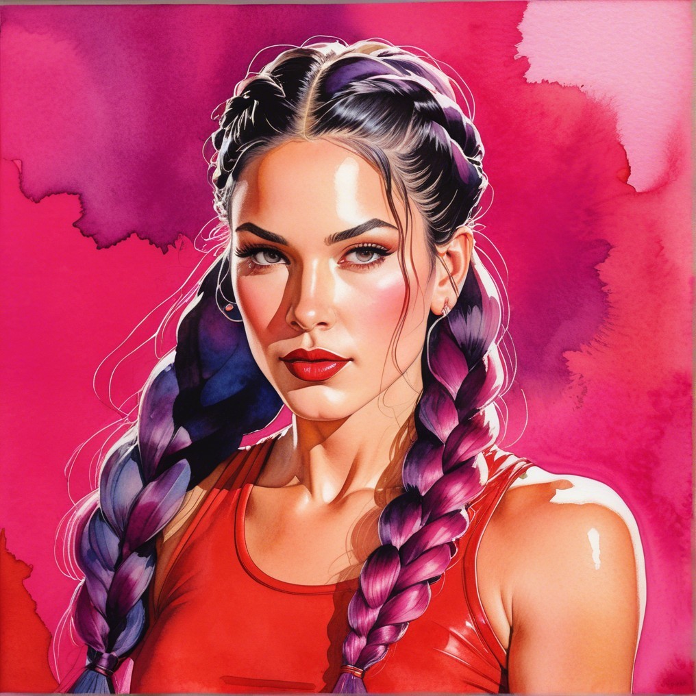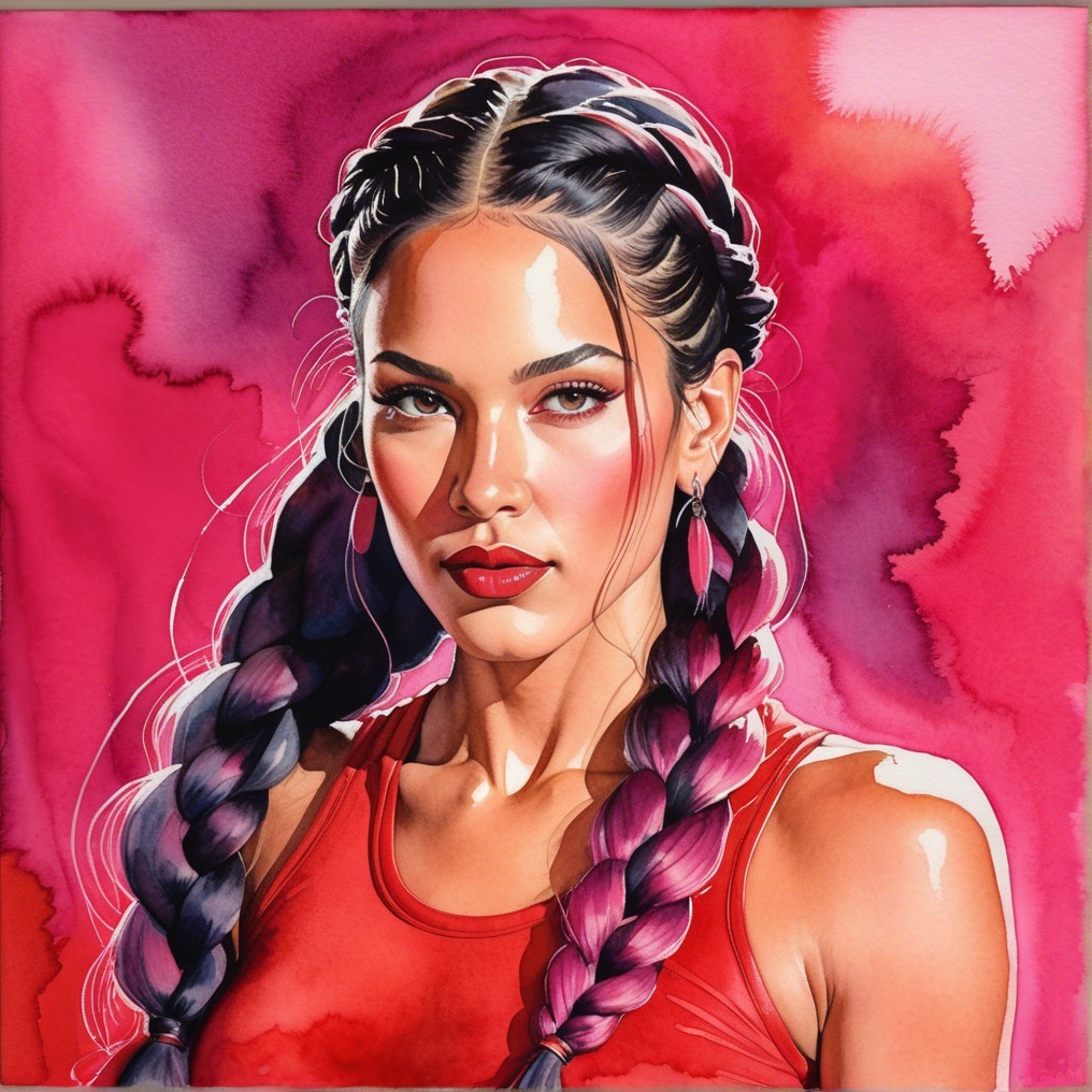Watercolor portrait,female diva with long braids, comic book art, contouring outlines by Barbara Canepa, watercolor and ink style by Barclay shaw, dynamic lighting 1.7, exaggerated features, background with red inked lineage and wavery pink gouache, stylized lineage illustration 1.5, subtle, cel-shaded, ethereal, mystical, frontal view, textured skin, organic + lineage & dethereal aspects, stylized, highly ephemeral (expressive face) in the styles of Florianne Becker and Overton Loyd, barclay shaw's lineage textures for juvenile look + light corrosive & acetate effect, pinkish tones with metallic colors, soft red pastel tones in gradients, hues, golden ratio, dyed lineage drawing with filament elements, maximalist fractalization, intricately patterned with red and squiggly zentangle lines in softened purple, marinism ,sculpted, acrylic ink, fabric and acetate texture, golden filaments, tall and lean details, stacked-up streaks, flowing hair illusion, visible brushwork, delicate soft lighting, triadic color scheme beige red pink, stylized illustration remiscent of stencil style,uhd, hdr, octane render illustration 1.5, sgraffito, streamline_moderne, Novelty architecture, soft rounded edges, quilling, delicate pink coloring 1.3 in soft warm colors, american gothic 1.7, rim dynamic lighting, tints of watercolor and ink, auracore, 3d effects, raytraced shadows, mythical, withered, geometric aesthetic integrity of lines & shapes. precision, overall composition by Florianne Becker, octane render, uhd, hdr, aquarelle extrusion, interplay of darkness and light, luminous, traumacore 1.9, juvenile, cel-shaded, somber, ,Schreger lines, high stylization, reminiscent of space age style, juvenile,Zentangle elegant, surreal, acrylic art, watercolor patchwork, spirals and intricate patterns, contour lines. very colorful. Flares and clouds, red and pink pastel, back-lit,