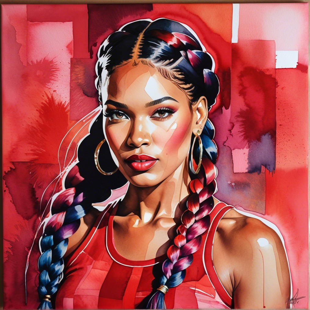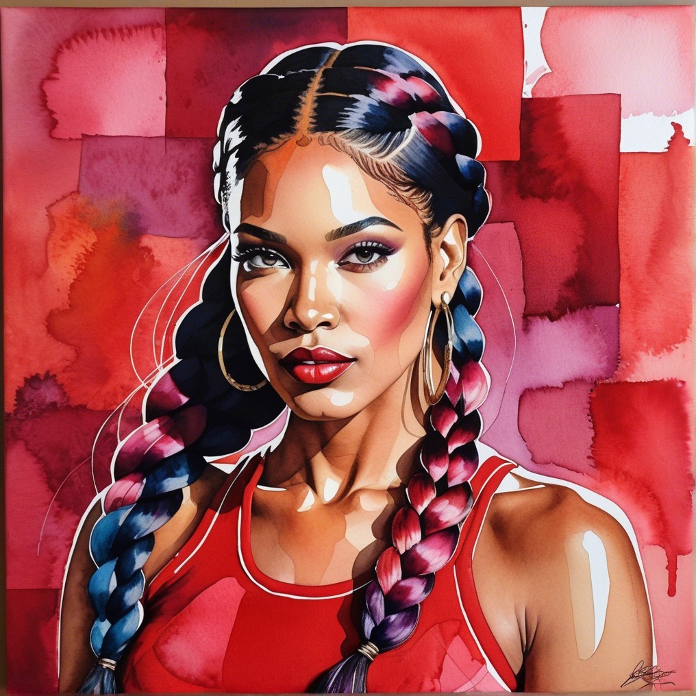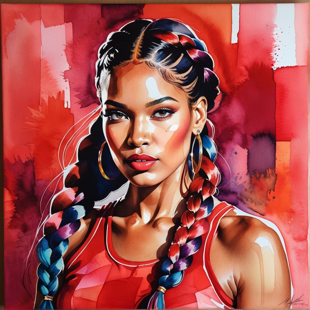Watercolor portrait,female diva with long braids, watercolor and ink style by Mark Aleksandrovich Abramov and Françoise nielly, dynamic lighting 1.7, 3D, Zentangle, elegant, brightness 1.43, watercolor patchwork, gradient hues, stippled, contouring outlines, zentangle lines. Very warm tones, beautiful acrylic art, watercolor patchwork. Tesselated Flares and clouds, contouring outlines by Barbara Canepa, red and pink pastel, back-lit, (watercolor and ink style by ho baron, ((razumov and garmash style, dethereal, Stacked-up perspective,), dyed skin, Watercolor details, organic + lineage & dethereal aspects) 8:11, stylized), highly natural (expressive face) in the styles of Mark Aleksandrovich Abramov and Overton Loyd, barclay shaw's intricate textures for grungy look + light corrosive & acetate effect, warm tones, raytraced shadows 1.2, divisionism, plasticity 1.6, luminosity 1.9, concept art reminiscent of sgraffitto, dynamic lighting 1.7, anisotropic filtering 1.7, tints of aquarelle, overspray of paint, overall composition by William Bradley