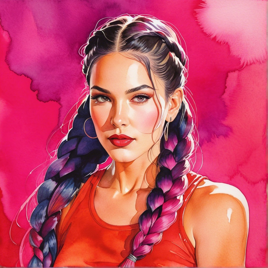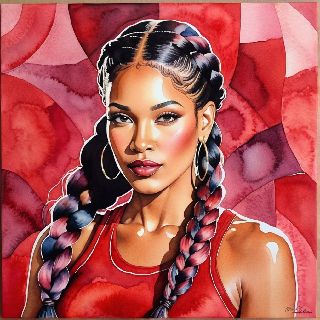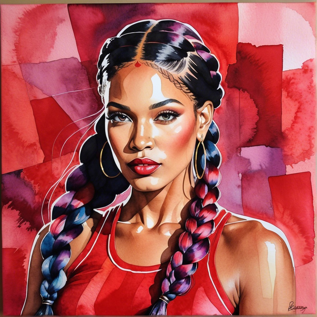 Watercolor portrait,female diva with long braids, watercolor and ink style by Mark Aleksandrovich Abramov and Françoise nielly, dynamic lighting 1.7, 3D, Zentangle, elegant, brightness 1.43, watercolor patchwork, gradient hues, stippled, contouring outlines, zentangle lines. Very warm tones, beautiful acrylic art, watercolor patchwork. Tesselated Flares and clouds, contouring outlines by Barbara Canepa, red and pink pastel, back-lit, (watercolor and ink style by ho baron, ((razumov and garmash style, dethereal, Stacked-up perspective,), dyed skin, Watercolor details, organic + lineage & dethereal aspects) 8:11, stylized), highly natural (expressive face) in the styles of Mark Aleksandrovich Abramov and Overton Loyd, barclay shaw's intricate textures for grungy look + light corrosive & acetate effect, warm tones, raytraced shadows 1.2, divisionism, plasticity 1.6, luminosity 1.9, concept art reminiscent of sgraffitto, dynamic lighting 1.7, anisotropic filtering 1.7, tints of aquarelle, overspray of paint, overall composition by William Bradley