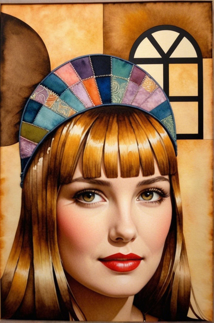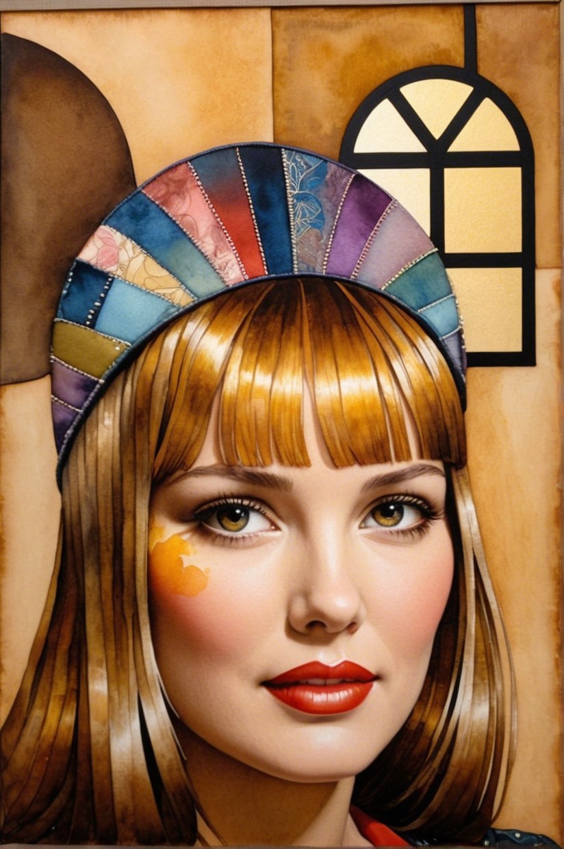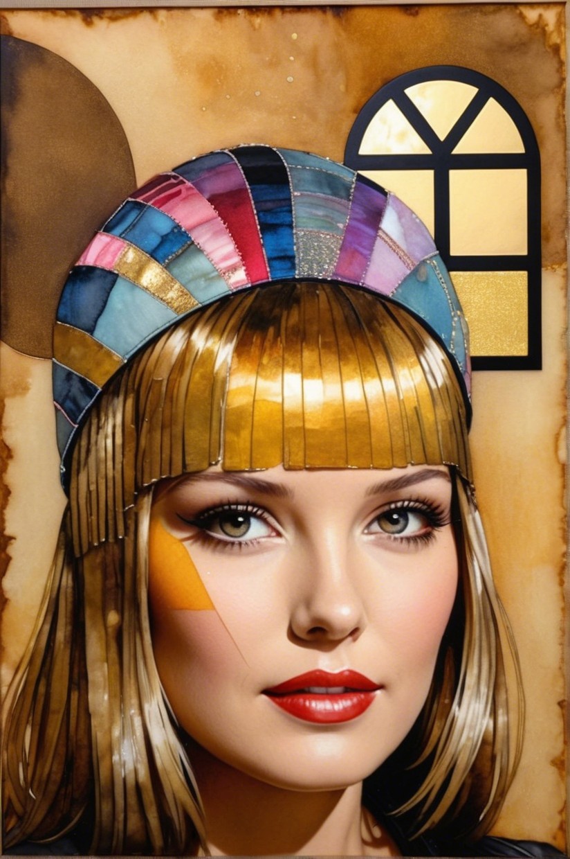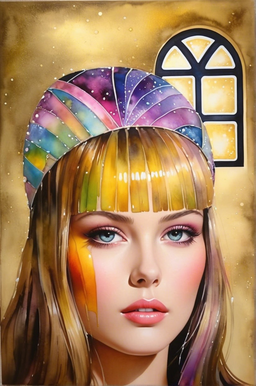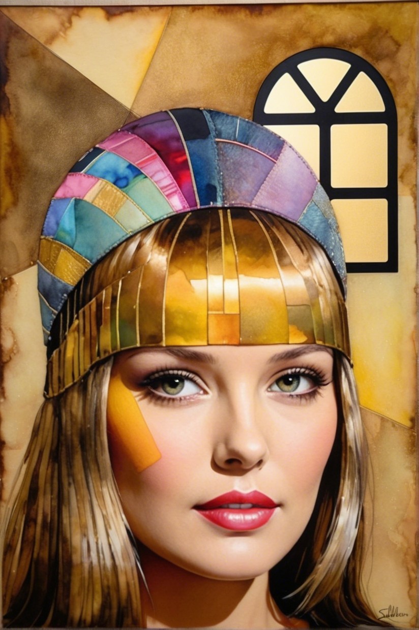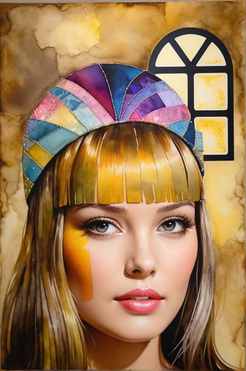 + Prompt:Vibrant patchwork creation with a retrofuturistic essence, utilizing wet-on-wet watercolor technique and estranged metallic paints. The artwork features a radiant and foreboding aesthetic, incorporating luminous effects and thinned wet-on-wet applications. The piece is a blend of ink and pen, alcohol wash, and pastels, creating an ephemeral and dreamlike atmosphere. The color palette includes pastel tones with sepia accents, enhancing the mystery-evoking retro-inspired style. The focal point is an ethereal young woman with tessellated black hair, set against a pale gold and silky beige backdrop. The artwork exudes a dystopian yet serene, gothical dark fantasy style, with dappled lighting from the top casting a warm color scheme. The background is whimsical, featuring bokeh effects and adhering to the Golden ratio, creating an ethereal atmosphere with a hint of grunginess. The composition includes abstract splashes, flares, and flecks, inspired by the styles of ho baron and Vivienne Westwood. The woman has beautiful pale skin, with a touch of fantastic realism, set in a luxurious setting. Her blond, tessellated hair cascades elegantly, and the upper body portrait captures a mysteriously ambient atmosphere against a picturesque wall. Precision. Precise Gelsculpt 64K, parallax occlusion 1.2, raytraced shadows 1.8, divisionism, quilling, swirly details, foampunk 1.7, overall composition by Didier Lourenço and frank miller