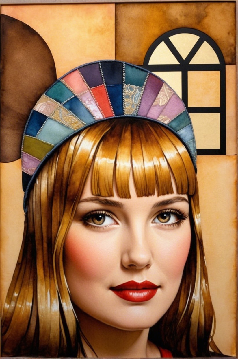 Prompt: Patchwork creation with a art nouveau essence by stan lee, wet-on-wet watercolor technique, layers, scruffy hatching, metallic paints, detailed embroidery, thinned wet-on-wet applications, ink and pen, alcohol wash, pastel tones, sepia accents, luminous effects, abstract and geometric elements, fragmented, patchwork, vibrant colors, blending of organic and technological elements, circular objects and intricate patterns, divisionism. background with textures, dots orbs and spheres embedded into the composition, retrofuturistic, luminism, 3D effects 1.8, tints by Frank Miller, Masterpiece wet-on-wet painting reminiscent of Louis Icart, featuring estranged metallic colors curated by David Graeme Baker. multi-textured, layered, sculpted elements, baroque aesthetics, mixed media collage approach, luminism, orbs, swirls, and vortexes, enhanced by soft dappled lighting and color glitch effects. Explore an abstract, otherworldly psychopomp theme with 3D effects, grunge, and boho influence, triadic color scheme of gold, pink, and yellow, golden ratio and rule of thirds for balanced composition. Capture unparalleled detail through textile fibers, paint flecks, and soft eroticism, accentuated by splash ink techniques and blotting. Merge aquatint with aquarelle extrusion, infuse bold strokes of ink, and incorporate cel-shaded elements for a retrofuturistic feel. Embrace sculpted forms, intricate linework, and windy, streamline moderne. Infuse the artwork with intricate textile details, 1970s animated marvel character vibes, and psychedelic art aesthetics. Achieve a highly detailed fantasy illustration with plasticity and overexposed effects, enhanced by parallax occlusion and ray-traced shadows. Implement a zentangle method, dynamic dappled lighting, warm pastels, warm lighting, reflections creating distortions, 3 point lighting, Overall composition by Georgia o'keffee and Vivienne Westwood and don Marquez: Flowing, Iridescent, Holographic,