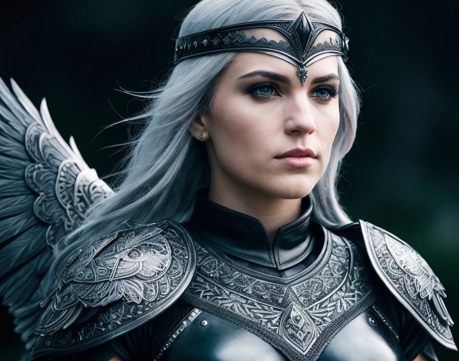 Prompt: dramatic, alluring, fierce, mystical, ethereal, intricate; a silver haired Valkyrie dressed in an obsidian black leather and silver armor stands atop a top a cliff edge with her fierce and majestic white Pegasus companion. The image portrays a look of determination and resolve on the Valkyrie's beautiful face. Show the bond between the Valkyrie and Pegasus