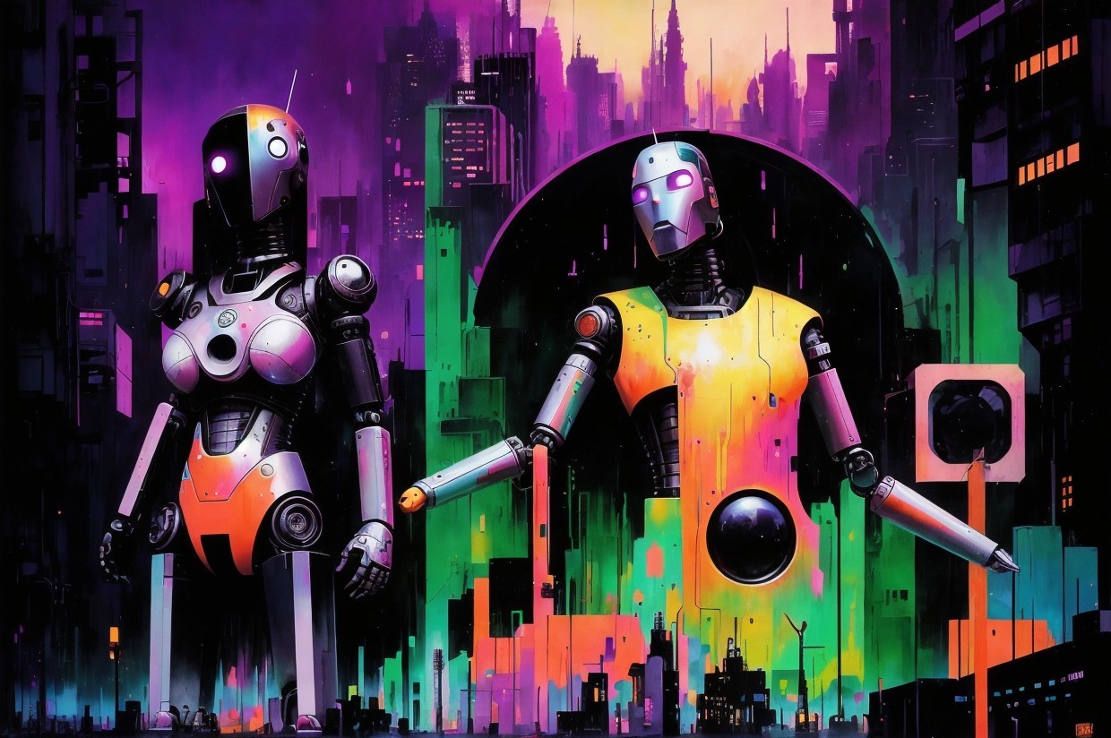 Two futuristic robots against a neon-lit cityscape background, with vivid purple and green hues dominating the scene.