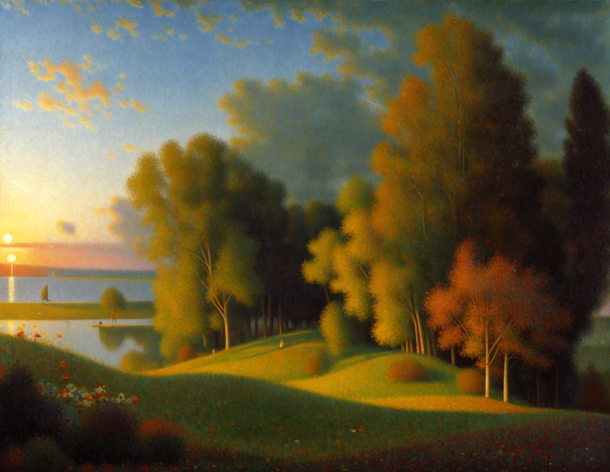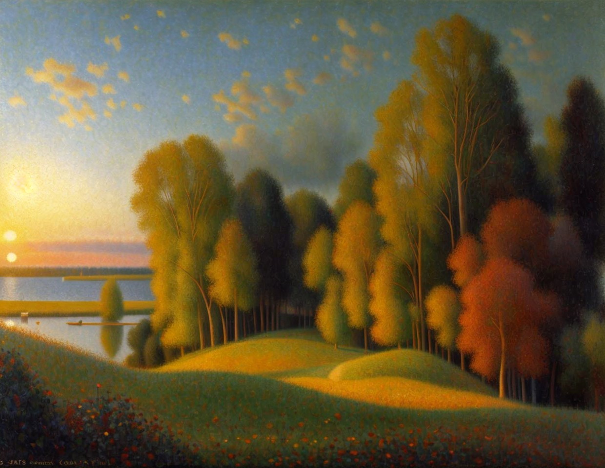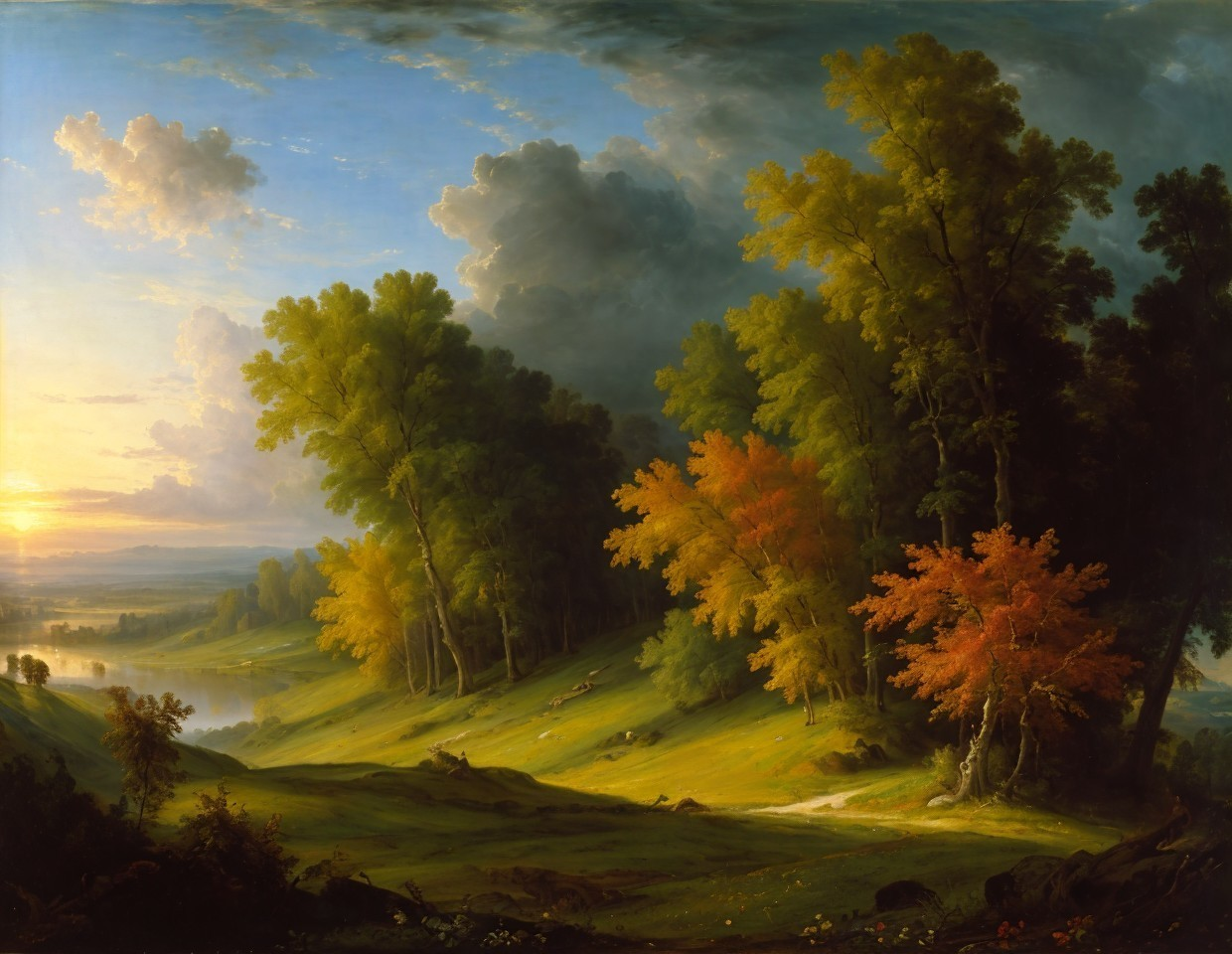 Prompt: "Oil on canvas, wide angle landscape view, a wonderful sunrise. Glowing with vibrant hues. Perfect composition. By Peter Paul Rubens. William Turner. By Pierre-Auguste Cot."