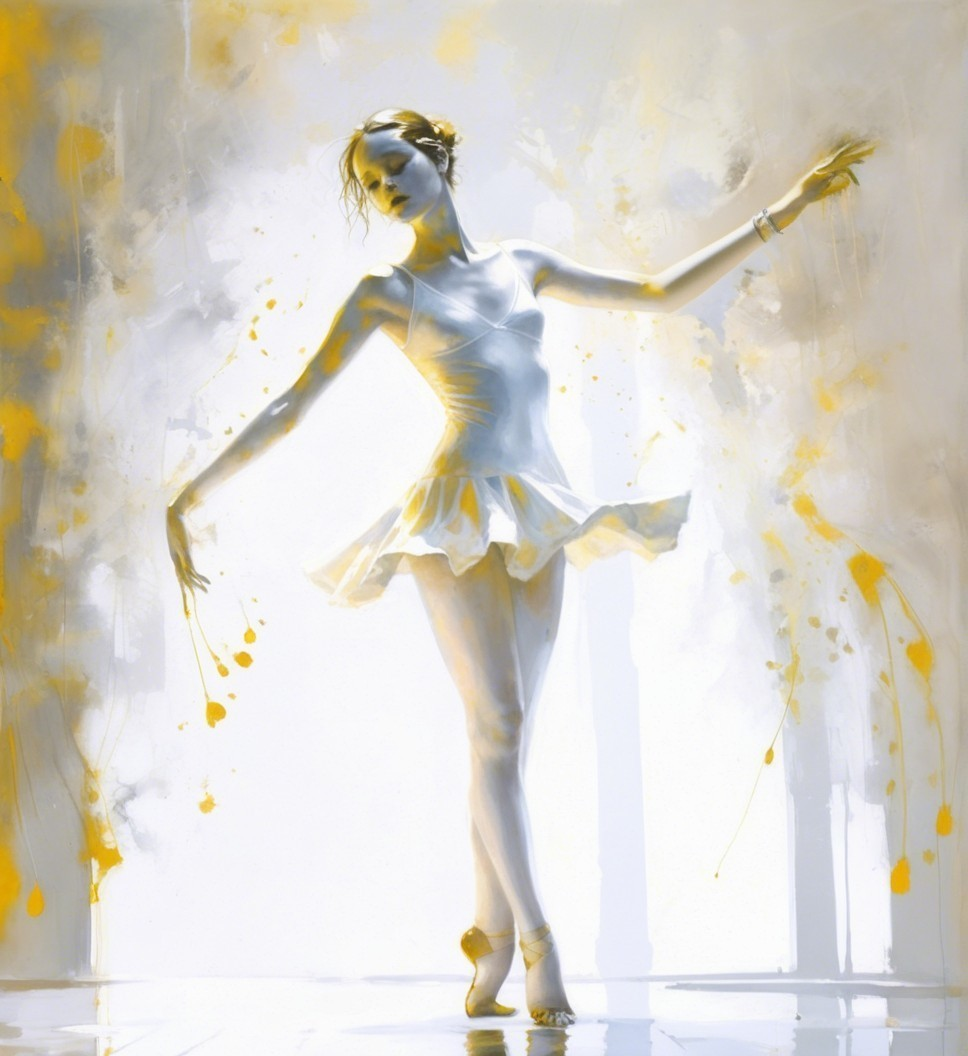 Prompt: "ballerina; fantastic drops of paint spreading like water with yellow-blue vinyl. statue of a girl's skin in paint with a green thin brush line is a figure of subtle light in the lens of sculptors. She gently caresses her thoughts with the stains of brushes and paints."