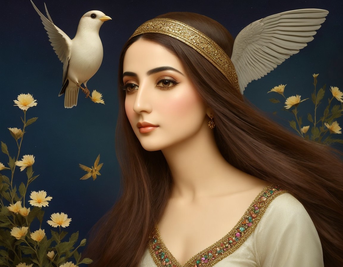 A digital artwork of a woman with serene expression, adorned in traditional attire among white doves, against a dreamy landscape.