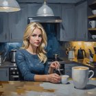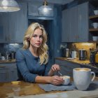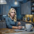 Prompt: Create an abstract impressionism nightly indoor portrait of a pretty blonde woman in the kitchen, preparing a coffee, with a worried expression. Night and quietness. Muted background. Use impasto, brush strokes, underpainting, complex interlaced layers, mixed textures, tones of black, dark grey, grey, white, yellow, gold, dark blue, light blue.