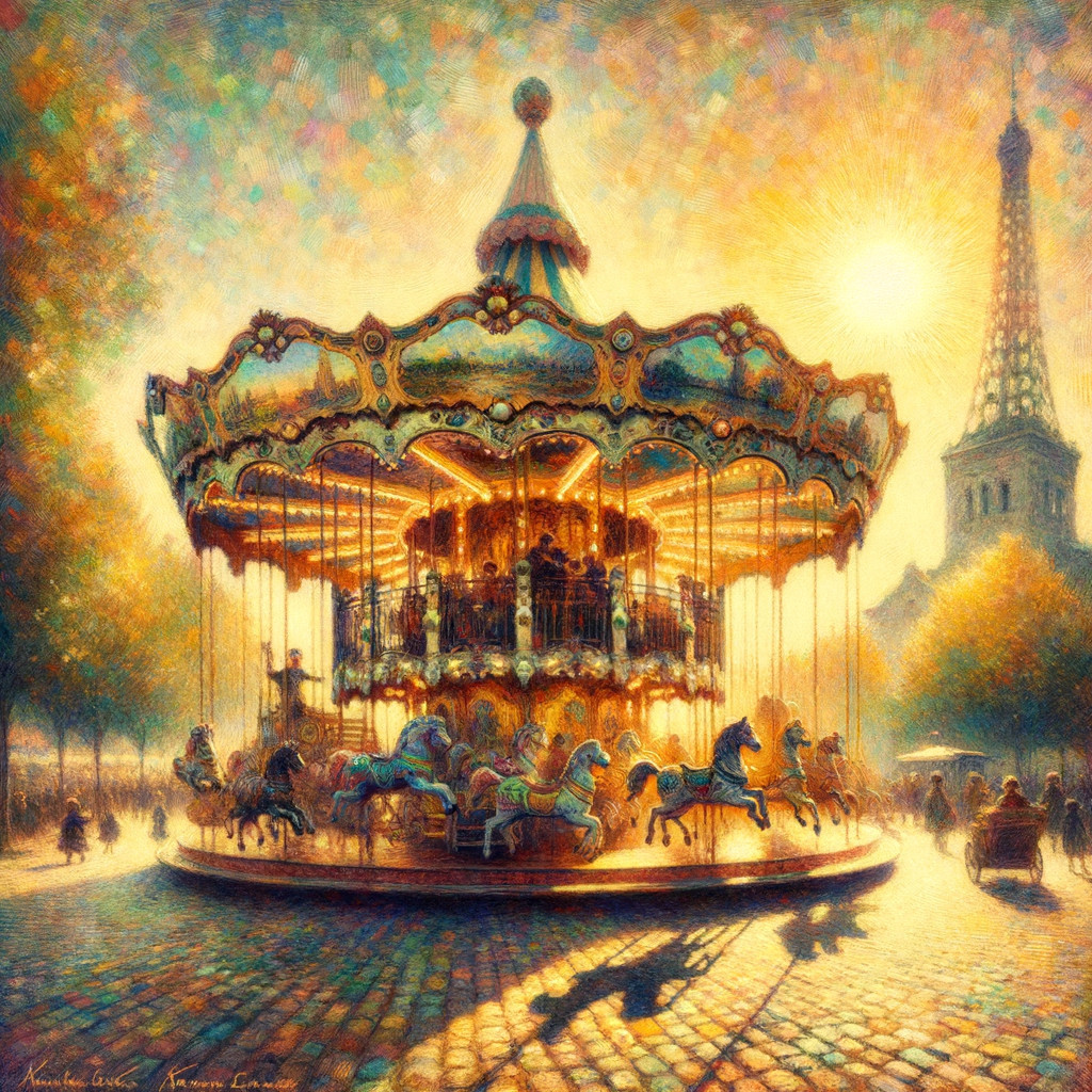 A vibrant carousel with ornate horses spins under a golden sunset, with the Eiffel Tower rising in the background and autumn trees lining the scene, creating a magical, nostalgic atmosphere.