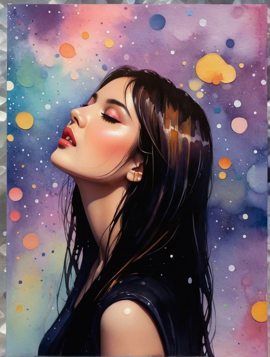 wet on wet watercolour artwork, stylized depiction, layered, multi-textured, ethereal, warm pastel paints, saturated color palette, VFX-inspired, novelty architecture, uhd, hdr ,patterned composition, zentangle; decent complete design, combining the wavery styles of Dee Nickerson and Iwona Lifsches with the calligraphic flowing lines of Agnes Miller Parker, Dramatic lighting, raytraced shadows, 3D half-relief, Tertiary colours Deeply saturated colors Extremely detailed, intricate, VFX-inspired, 4K hdr crisp lines and sharp focused detail, brushed textures, visible brushwork, gradient inking colors, flecks, splashes, dots, blur, silver particles, metallic sparkling, raytraced shadows 1.8, overspray of paint, blotting, loose water effects, Bloom-Effect, plasticity 1.3, complexion 1.1, custom_loss:edge, detailed composition, simplistic, fauvistic, a young enchantress with tousled, curly hair,tessellated, silk adorned with intricate patterns, calm ,tranquility, subtle, dark fantasy atmosphere, dreamy, hazy breezy, whimsical, hyper-realistic, line-art details, blur, octane render illustration, luminosity 1.8, precise Gelsculpt 64K, serenity., Key integrations: Flowing Iridescent Holographic organza -semi diaphanous- reminiscent of artist Karina Llergo