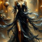 A regal figure in a stunning black feathered gown stands gracefully in an opulent, dimly lit room, surrounded by ornate architecture and flickering candlelight, exuding elegance and mystery.