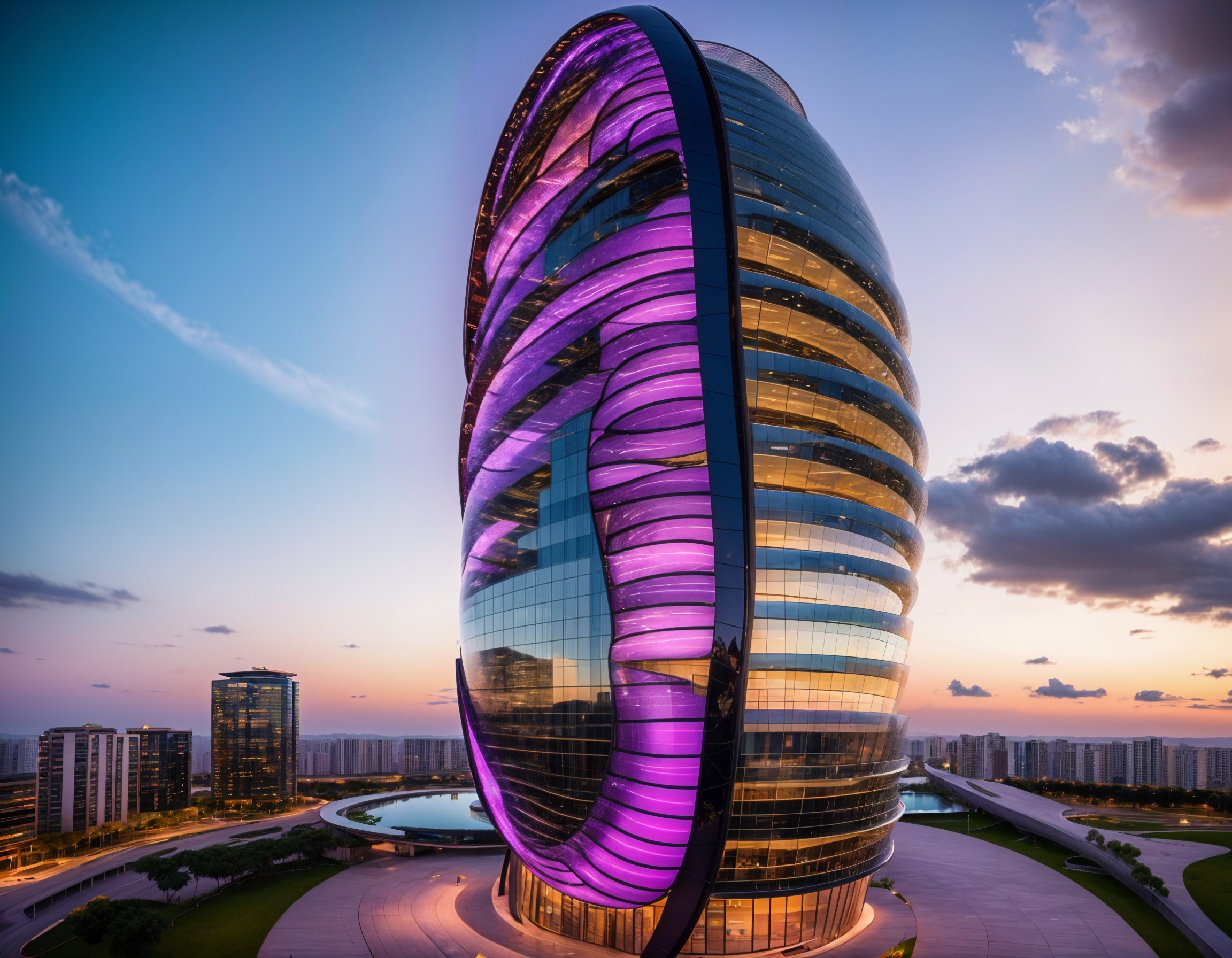 A stunning, futuristic building with a spherical design features vibrant purple and gold lighting. Surrounded by green space, it contrasts beautifully against a blue sky and urban skyline.