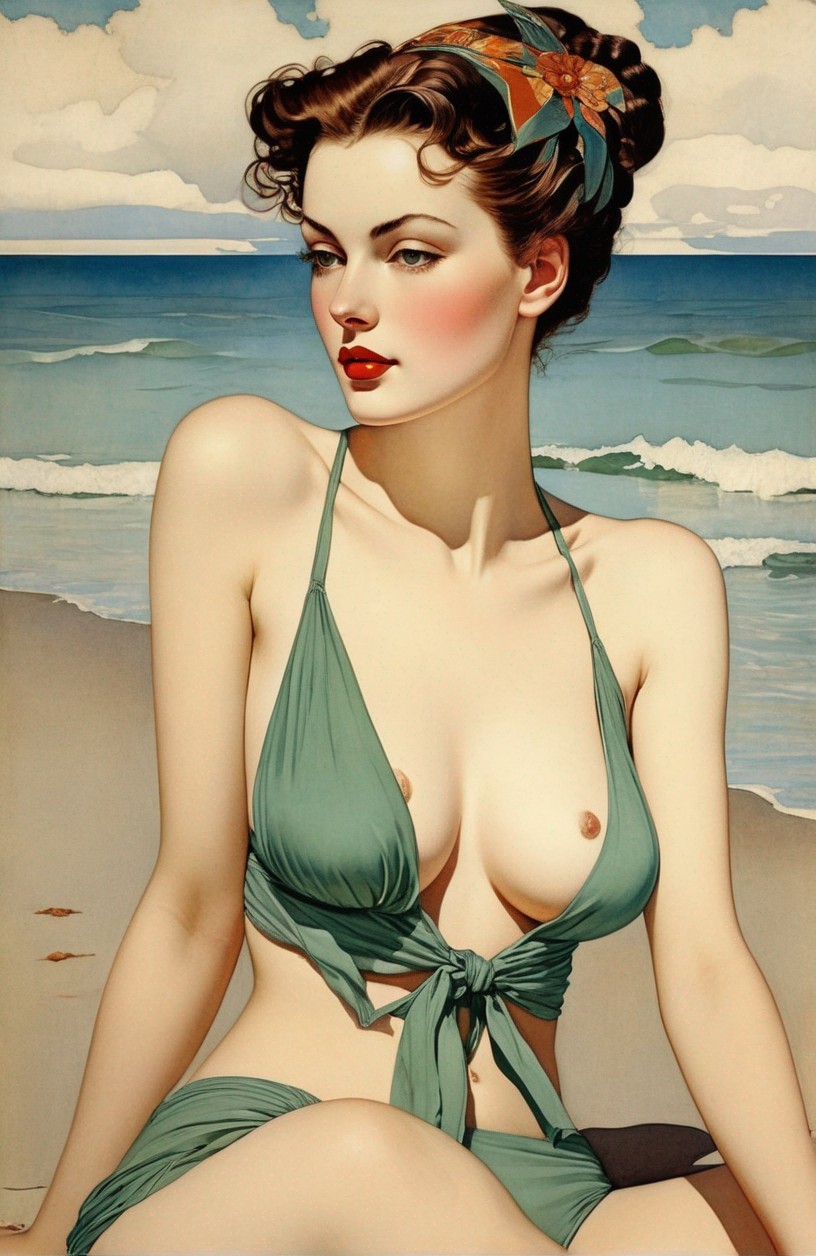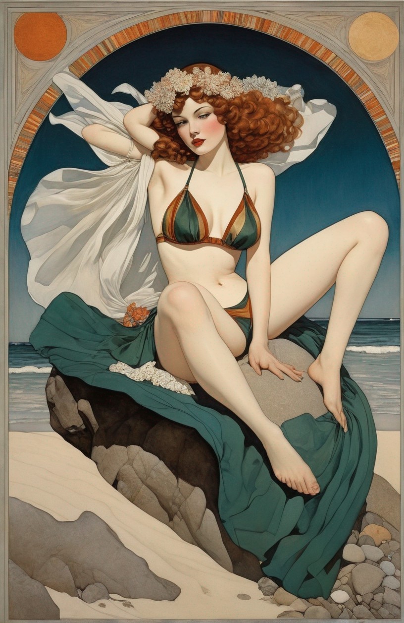 An illustrated woman in a vintage-style blue swimsuit poses against a beach backdrop, with a flower in her hair.