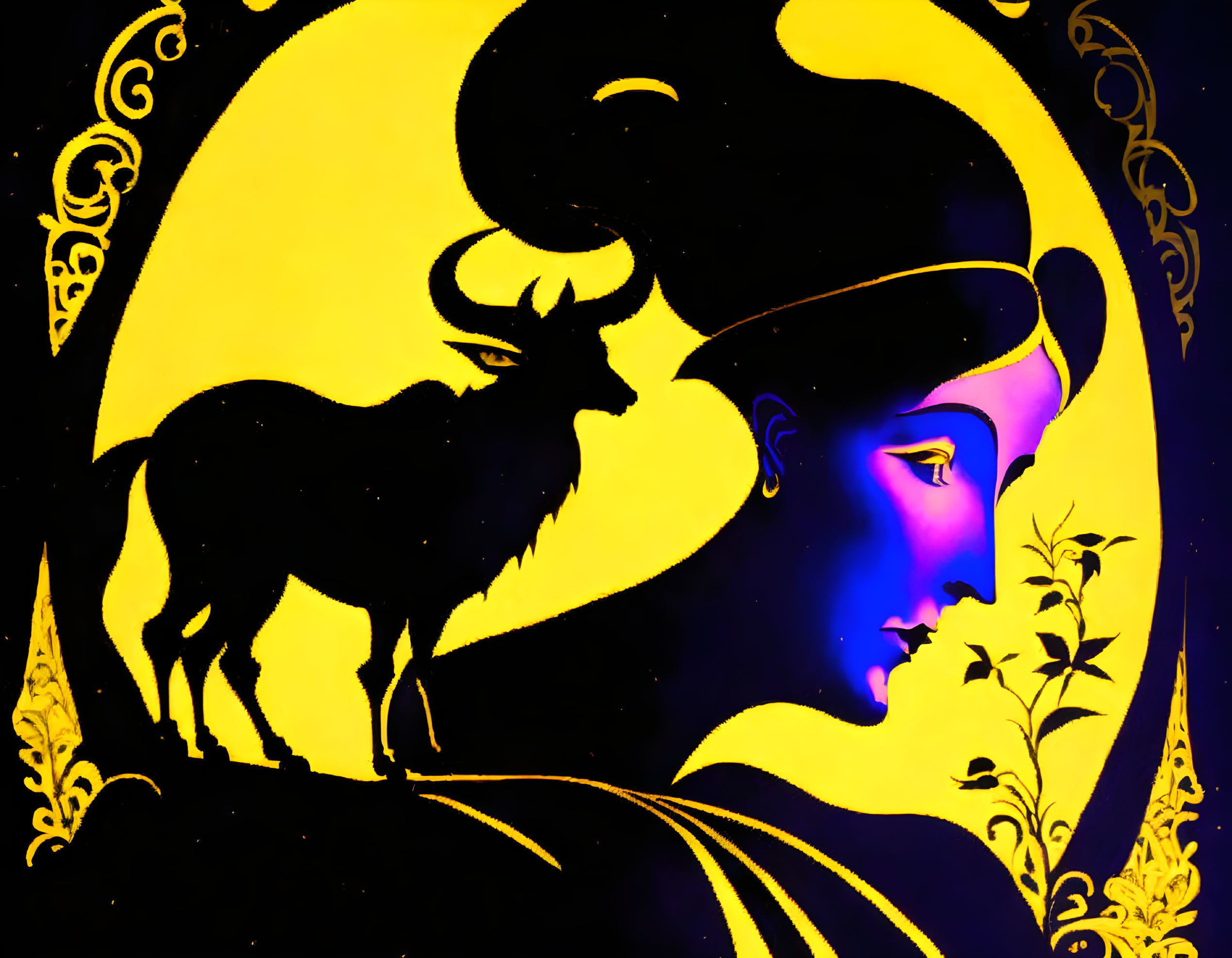Colorful Silhouette Illustration: Goat, Moon, and Person Profile Integration