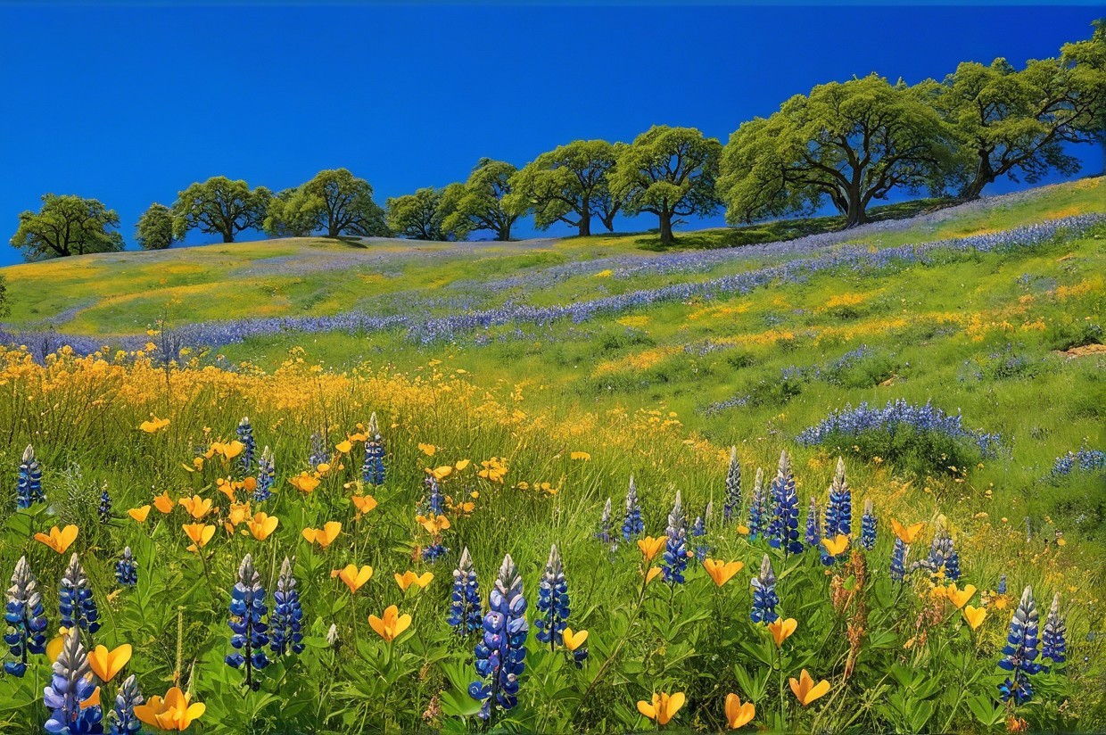 A vibrant spring landscape featuring a lush hillside covered in colorful wildflowers, including bright red poppies and purple lupines, under a clear blue sky and green trees in the background.