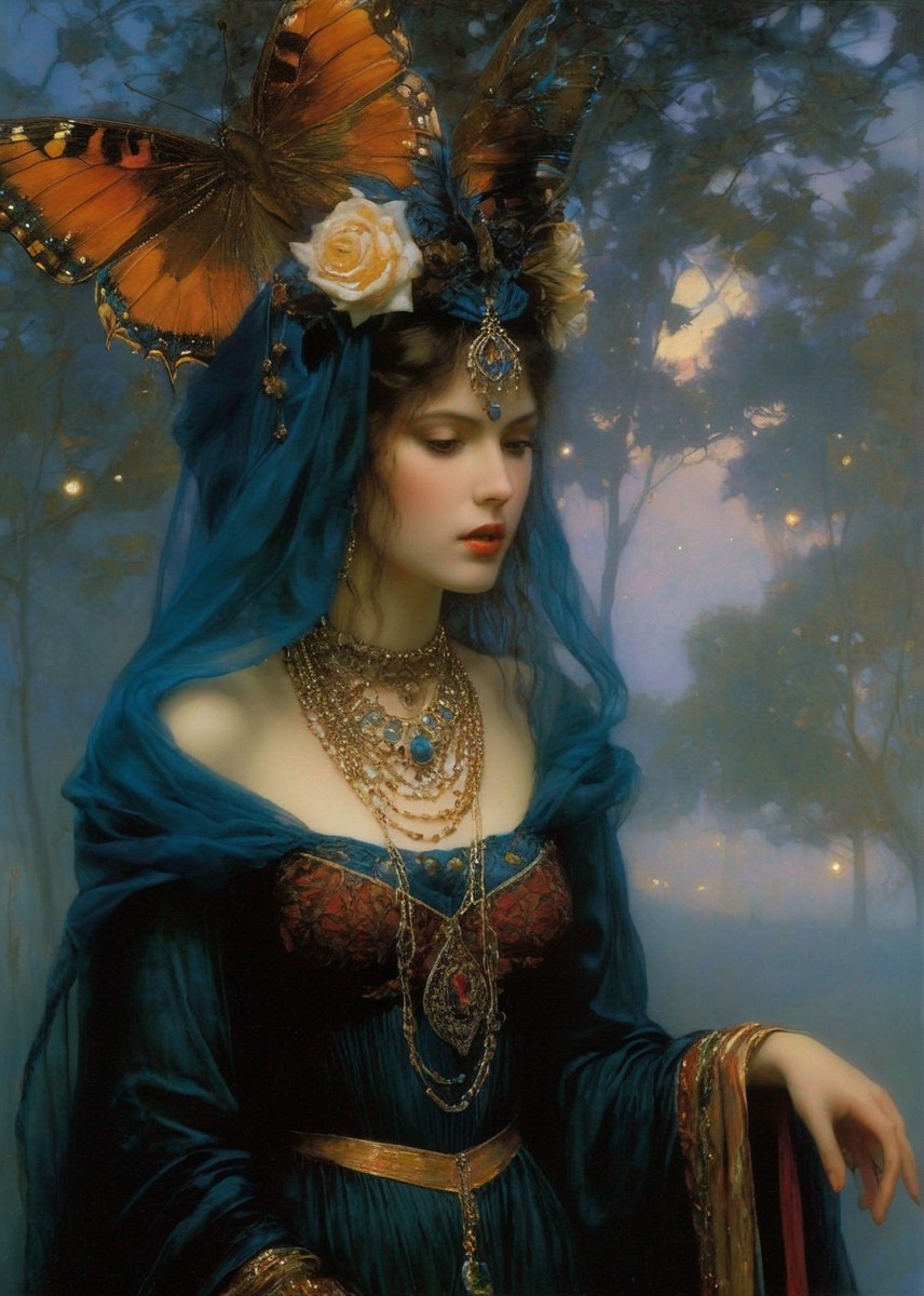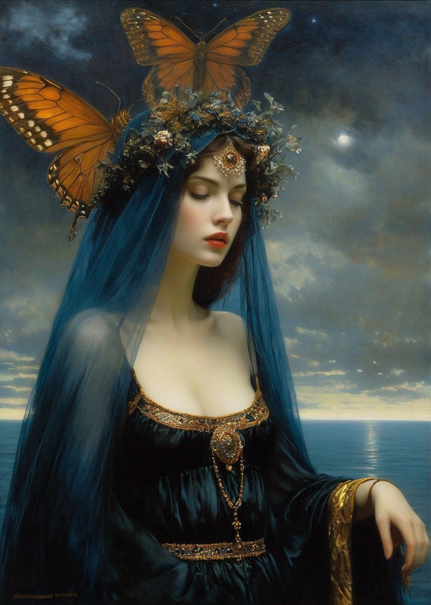 A painting of a woman with butterfly wings in her hair, a dark dress with golden accents, gazing introspectively against a seascape.