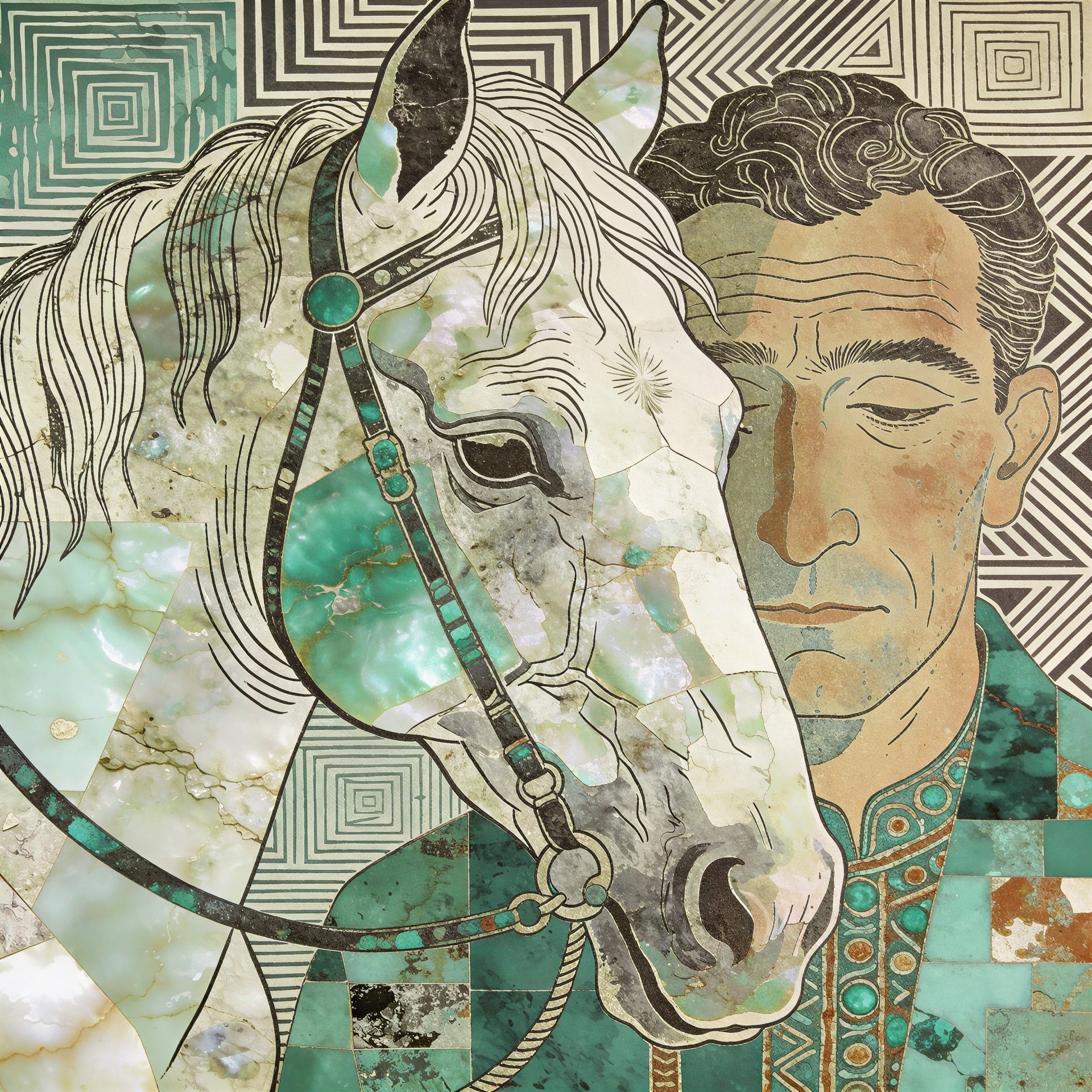 A detailed mosaic of a man and a horse made from mother-of-pearl, turquoise, and other stones in shades of green, brown, and off-white. The horse, facing left, is mostly off-white with hints of light green, featuring a bridle with green gemstone accents. Its