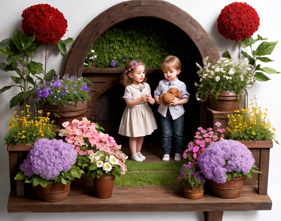 Prompt: "<lora:Strong Expression:1.2> inspired by "Julie Arkell"folk-art stylefocus on handcrafted textures soft, earthy color palette, two toddlers are playing in a beautiful flowerful garden with their puppies, masterpiece, hyperdetailed, harmonic colors, studiolight, 8k"