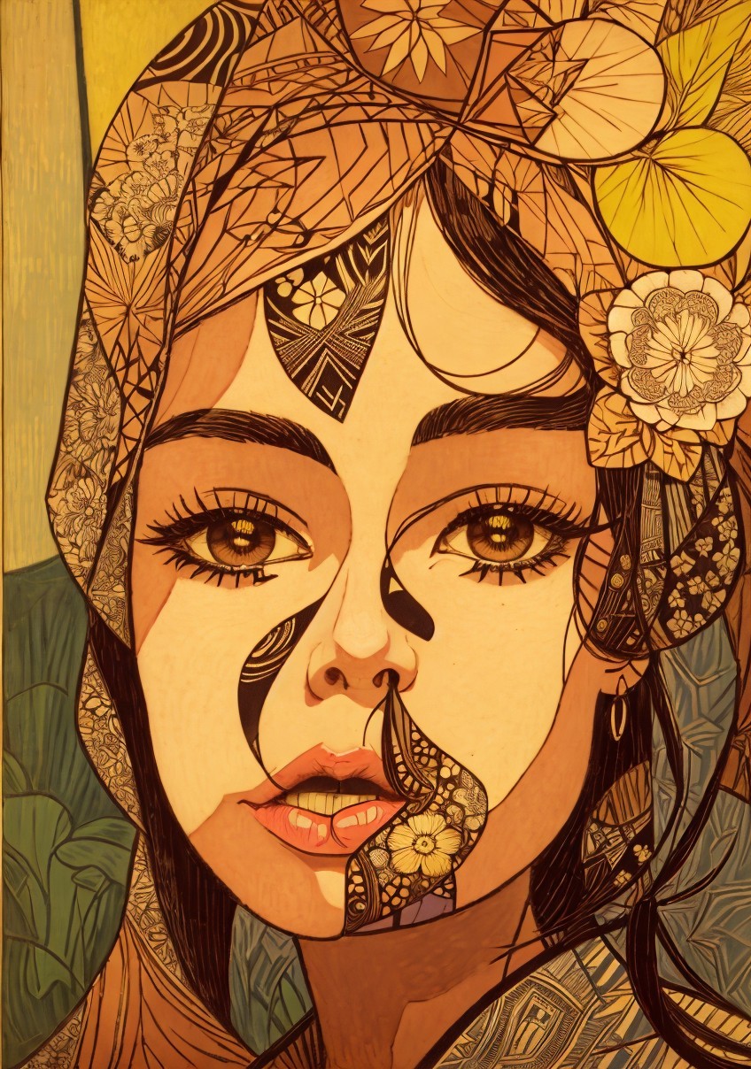 Stylized woodblock print, stylized line-art Portraiture, lineage patterns form beautiful female face, dark brown and muted yellow tones, (((hues, style by Meghan Duncanson, Arthur Rackham, Grant Wood, Paul Klee, Lisa Frank, Van Gogh, Overton Loyd, Margaret Keane, american gothic 1.9), Geometrical portrait of a woman with curly hairstyle) 8:5), lace-draped, soft tones of ochre and yellow, abstract, stylized lines, geometrical composition, concept art, symbolic, serene, delicate coloring,somber, digital art, detailed focus, subtle textures, textured surface, comical, elaborated textures, graceful spirals, pastel tines of yellow reddish-brown auburn, close-up, detailed beauty, ,traumacore 1.4, brightness 1.4, high coloring 1.7, geometrical illustrative style, Pastel colors of green reddish-brown beige, crisp quality, vector 9:5, intricate stylized hairstyle, perfect beautiful handsface, zentangle method, american gothic 1.7, dynamic lighting 1.7, 3d effects 1.8, ambient occlusion 1.2, anisotropic filtering 1.2, raytraced shadows 1.3, stylized lineage illustration, hues, delicate coloring, octane render illustration 1.5, geometrical features, zentangle method, dynamic lighting, inviting, very stylized illustration 1.8, soft rounded edges, quilling, moody, folded paper style 1.9, high plasticity, spiritual essence, beautiful composition 1.9, high coloring 1.9, brightness 1.9,, Schreger lines, streamline_moderne, magical realism, dots and flares and splashes,