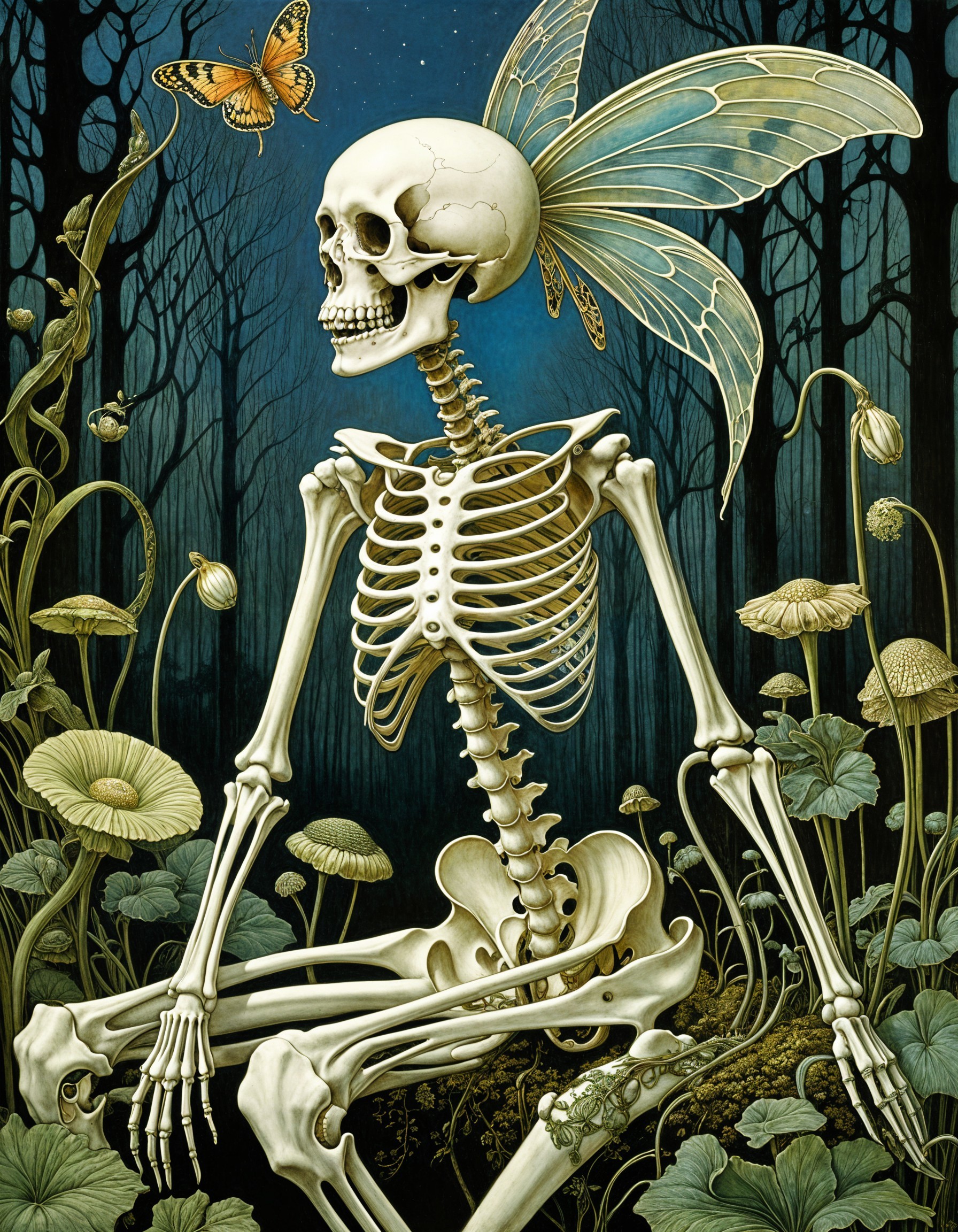 A whimsical skeleton sits amidst vibrant mushrooms and flowers, adorned with a large butterfly wing on its head, blending the themes of nature and mortality in a dreamy forest setting.