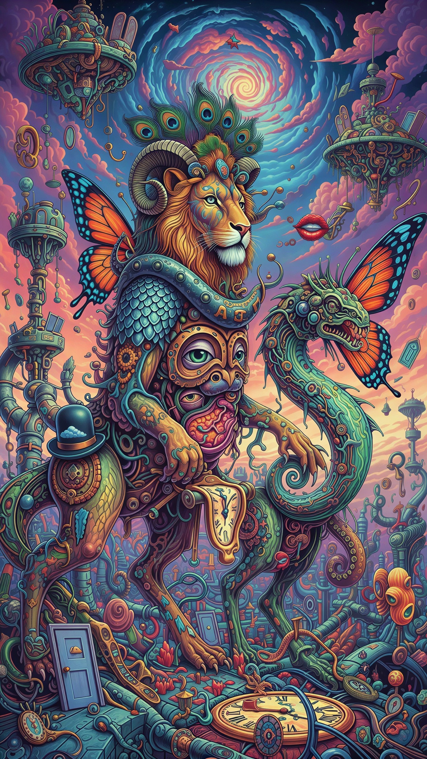 A psychedelic and whimsical composition, a surreal lion with a ram’s horns, peacock feathers, and butterfly wings, is the central figure in an intricate and vibrant wonderland, surrounded by a complex collage of winding pipes, gears, and fantastical elements. The lion, adorned with detailed patterns and colorful markings,