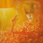 Three ethereal, stylized faces with vibrant hair blend seamlessly into a lush array of orange roses. The warm colors create a dreamy, harmonious atmosphere, evoking a sense of tranquility.