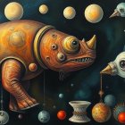 The artwork features a whimsical, mechanical rhinoceros interacting with a quirky, bird-like creature. Surrounded by colorful planets and celestial objects, it blends surrealism and fantasy.