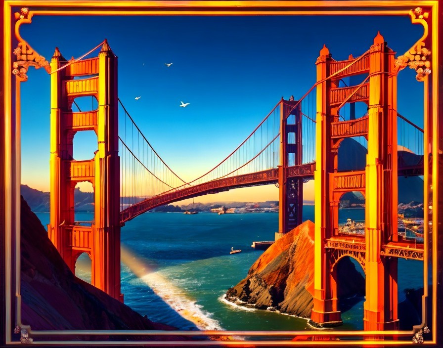 A majestic tiger wades in water at the Golden Gate Bridge's entrance, with boats sailing nearby, framed within a decorative border.