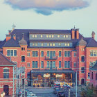 A stunning brick building features intricate architectural details, large windows, and a welcoming atmosphere. Nearby, traffic lights and outdoor seating create a vibrant urban scene.