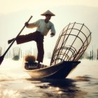 A fisherman skillfully navigates a boat on a tranquil lake at sunset. He balances on one foot while using a paddle, showcasing traditional fishing techniques amidst stunning silhouettes.